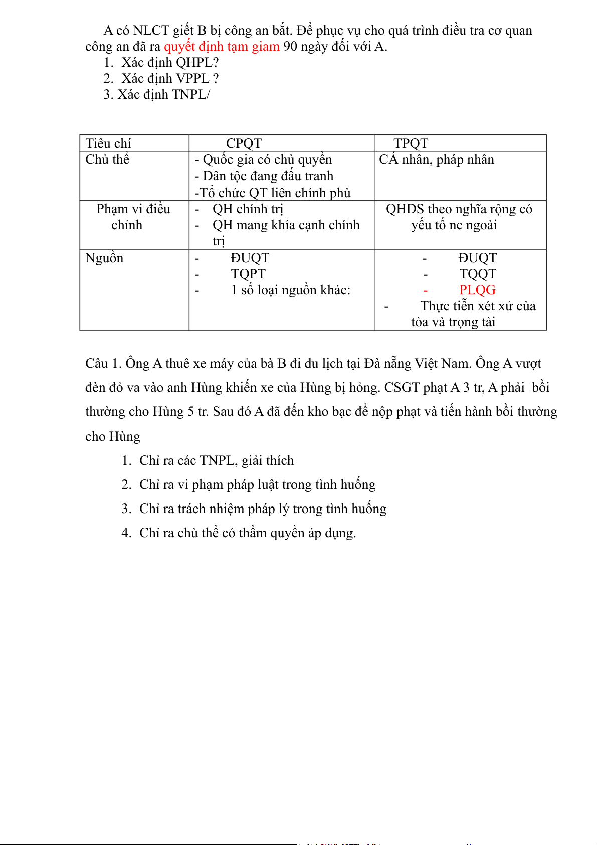 công an đã ra quyết định tạm giam 90 ngày đối với A. 1. Xác định QHPL? 2. Xác định VPPL ? 3. Xác định TNPL/ Tiêu chí CPQT TPQT Chủ thể - Quốc gia có chủ quyền CÁ nhân, pháp nhân