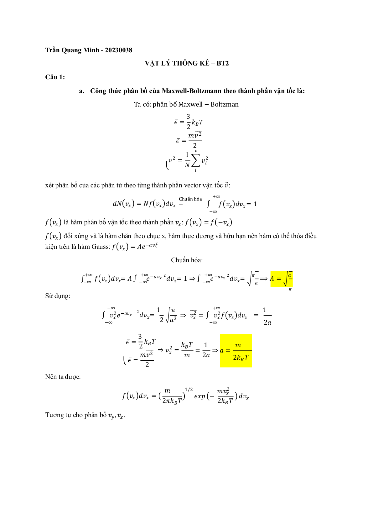 VẬT LÝ THÔNG KÊ – BT2 Câu 1: