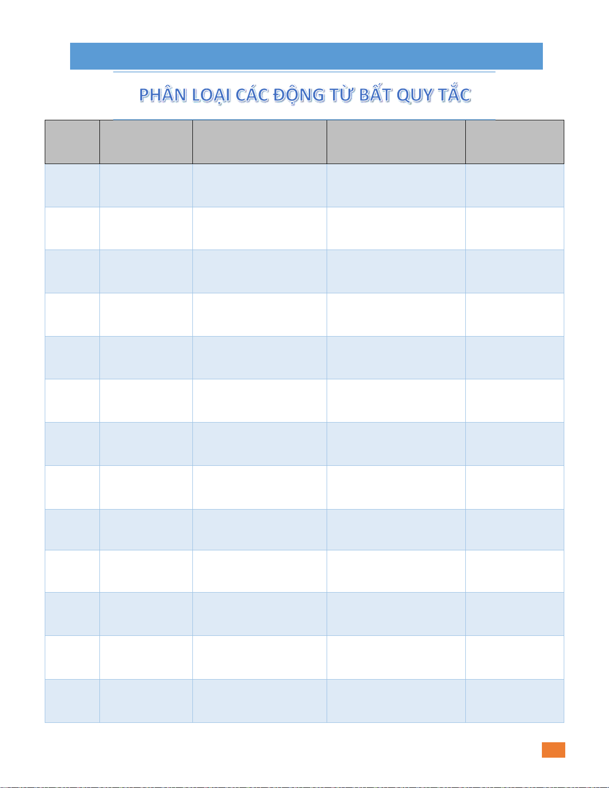 Cả 3 c ột đều giống nhau Cut / Cut Cut 1 Cắt, chặt kʌt/ /kʌt/ /kʌt/ Hit Hit Hit 2 Đụng, ánh /hit/ /hit/ /hit/ Hurt Hurt Hurt Làm au, 3 /hə:t/ /hə:t/ /hə:t/ làm bị thương Let Let Let Cho phép, 4 /let/ ể /let/ /let/ cho Put Put Put 5 Đặt, ể / put / / put / / put / Read Read Read 6 Đọc / ri:d/ / ri:d/ / ri:d/