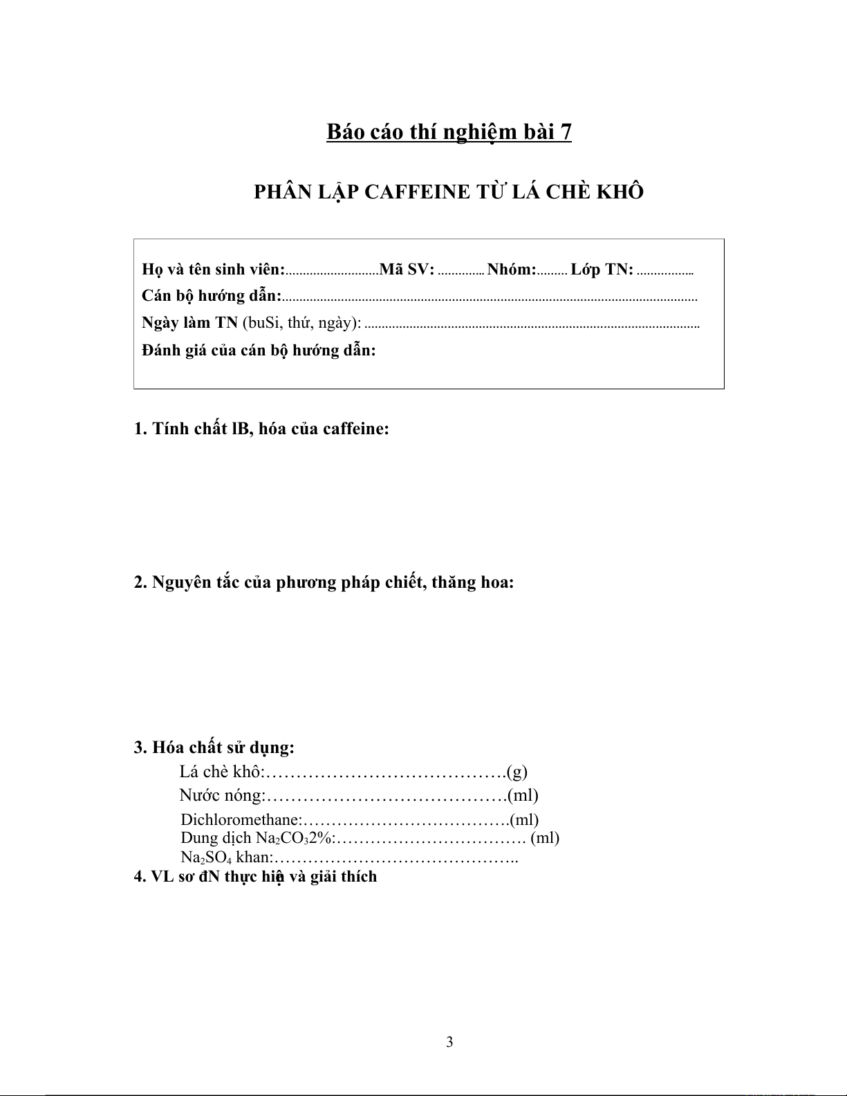 caffeine sau đó so sánh với nhiệt độ nóng chảy tra trong sS tay Hóa học để đưa ra kết luận. 2 Báo cáo thí nghiê /m bài 7