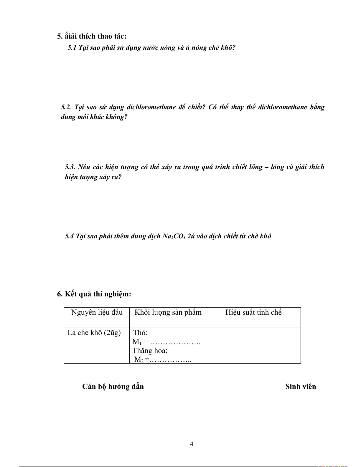 6. Kết quả thí nghiệm: Nguyên liệu đầu Khối lượng sản phẩm Hiệu suất tinh chế Lá chè khô (20g) Thô: M1 = ……………….. Thăng hoa: M2 =……………..