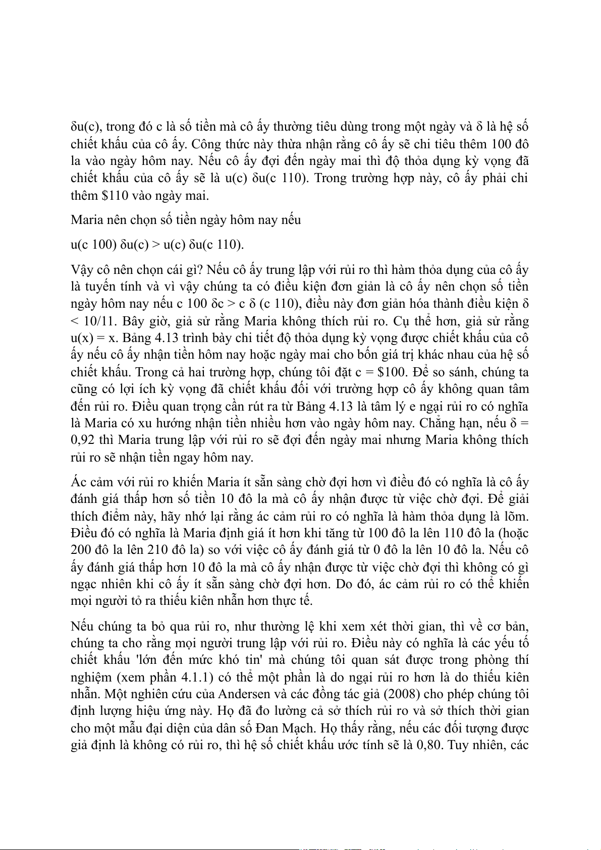 u(x) = x. Bảng 4.13 trình bày chi tiết độ thỏa dụng kỳ vọng được chiết khấu của cô