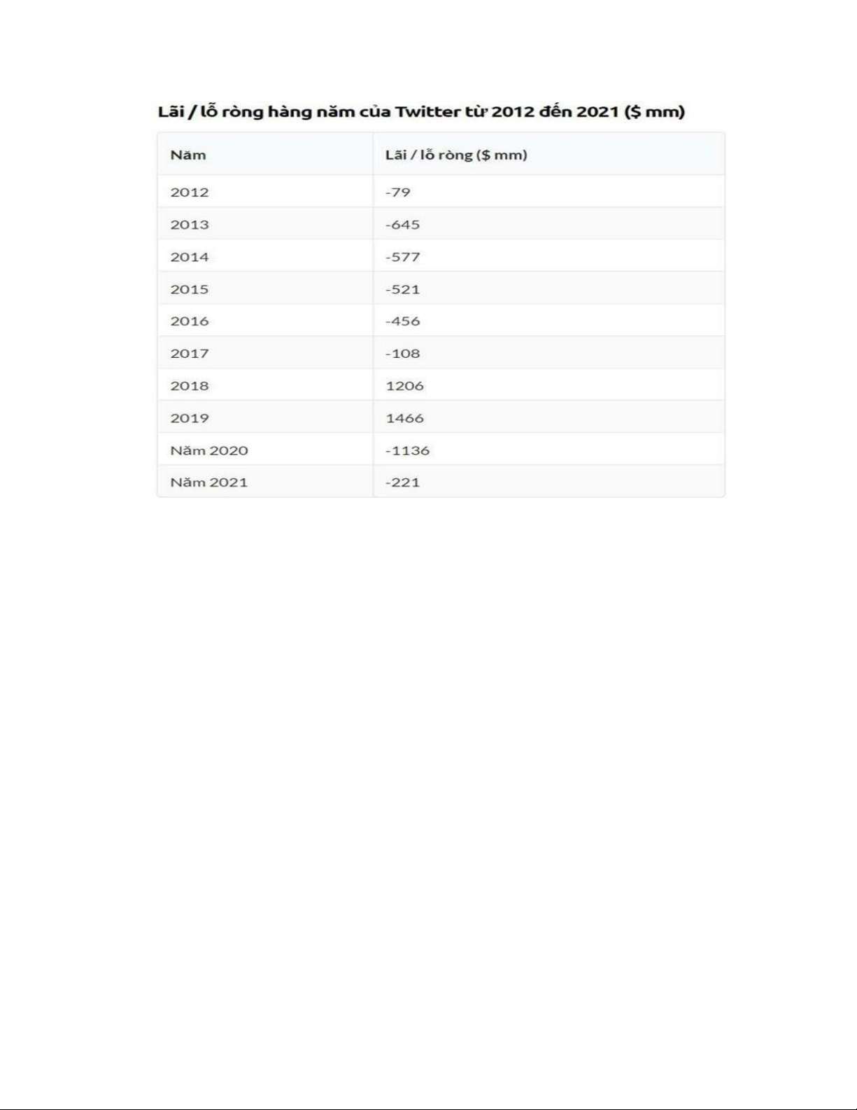 Bảng 1: Lãi/ Lỗ hàng năm của Twitter từ năm 2012 đến năm 2021 ($mm)