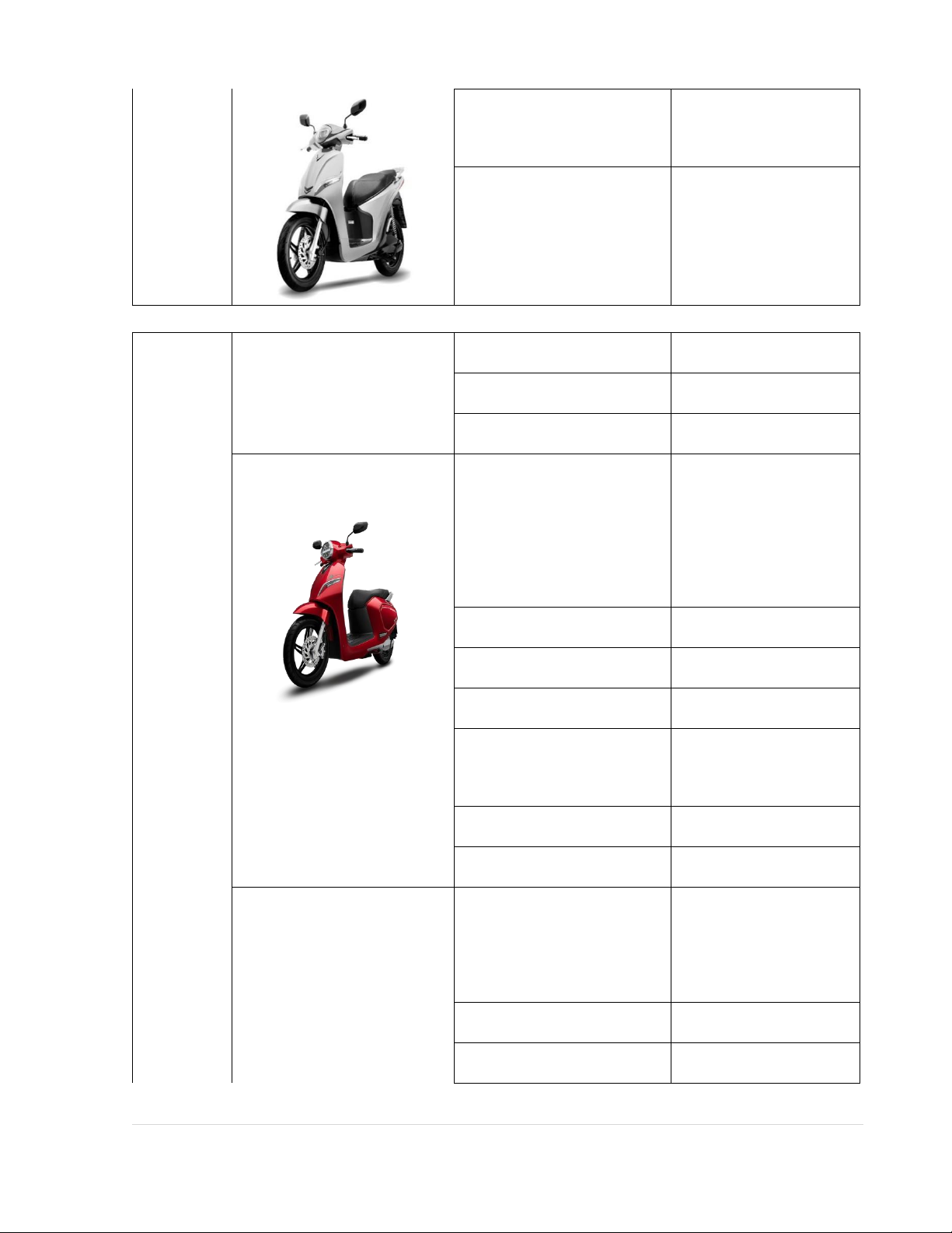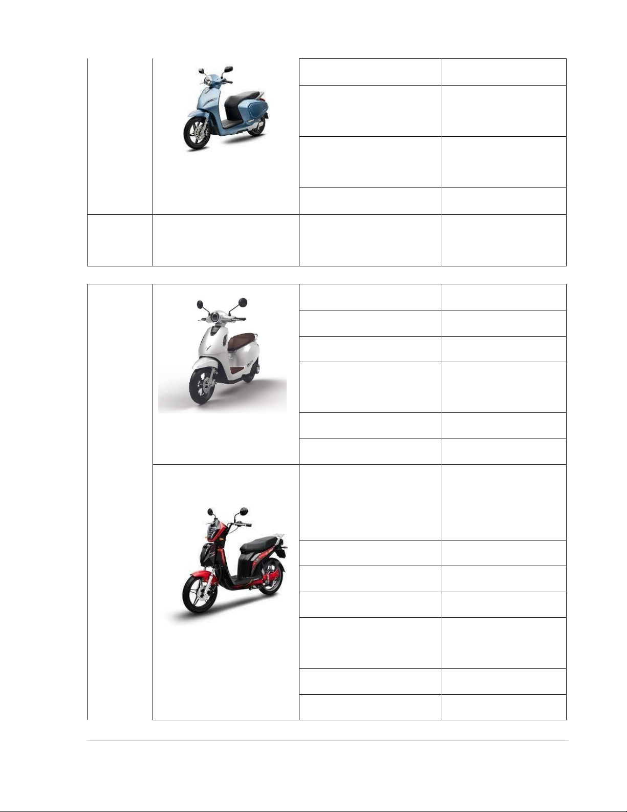VINFAST KLARA S Màu sắc Xanh lục, Xanh (36.900.000 VNĐ) đậm-đen, Trắng ngọc trai-đen, Đen nhám, Đỏ đậm-đen Công suất danh định 1800 W Tốc độ tối đa 78 km/h Trọng lượng 112 kg Kích thước 1895 x 678 x 1130 (dài x cao x rộng) mm PIN 01 Pin LFP Thời gian sạc 6h VINFAST KLARA Màu sắc Trắng, Xanh đậm, A2 Xám, Đỏ Nâu, (26.000.000 VNĐ) Xanh nhạt Công suất danh định 1.200 W Tốc độ tối đa 60km/h 19 | P a g e lOMoAR cPSD| 45315597 Trọng lượng 127kg Kích thước 1890 x 684 x 1125 (dài x cao x rộng) mm Ắc quy Ắc-quy chì axit kín khí, 6 bình nối tiếp Thời gian sạc 11h PHỔ VINFAST EVO200 Màu sắc Đen, đỏ,xanh, THÔNG (22.000.000 VNĐ) trắng, vàng Công suất danh định 1500 W Tốc độ tối đa 70km Trọng lượng 79kg Kích thước 1804 x 683 x 1127 (dài x cao x rộng) mm PIN 01 Pin LFP Thời gian sạc 10h VINFAST LUDO Màu sắc Đỏ , Xanh da trời , (12.900.000 VNĐ) Xanh tối, Xám , Trắng Công suất danh định 500 W Tốc độ tối đa 35 km/h Trọng lượng 68 Kg Kích thước 1700 x 715 x 1070 (dài x cao x rộng) (mm) PIN Pin Lithium Thời gian sạc 3- 4,8h 20 | P a g e