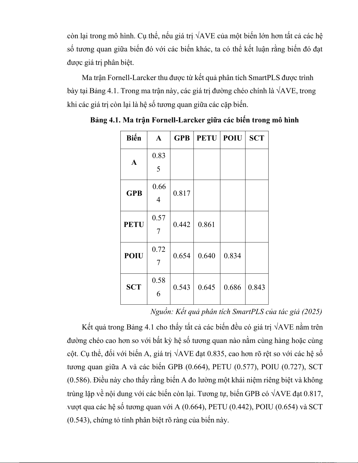 Bảng 4.1. Ma trận Fornell-Larcker giữa các biến trong mô hình Biến A GPB PETU POIU SCT 0.83 A 5 0.66 GPB 0.817 4 0.57 PETU 0.442 0.861 7 0.72 POIU 0.654 0.640 0.834 7 0.58 SCT 0.543 0.645 0.686 0.843 6