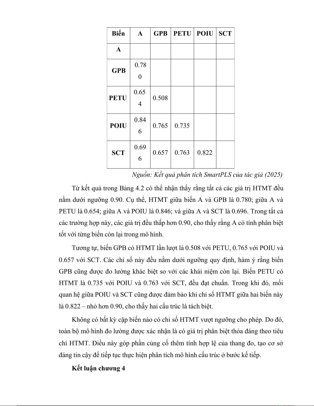 Bảng 4.2. Ma trận tỷ lệ HTMT giữa các biến trong mô hình Biến A GPB PETU POIU SCT A 0.78 GPB 0 0.65 PETU 0.508 4 0.84 POIU 0.765 0.735 6 0.69 SCT 0.657 0.763 0.822 6