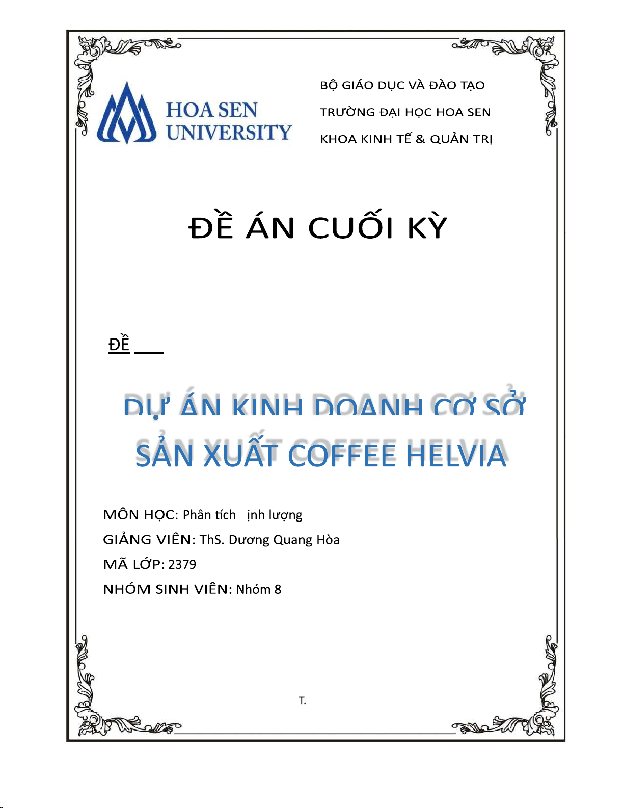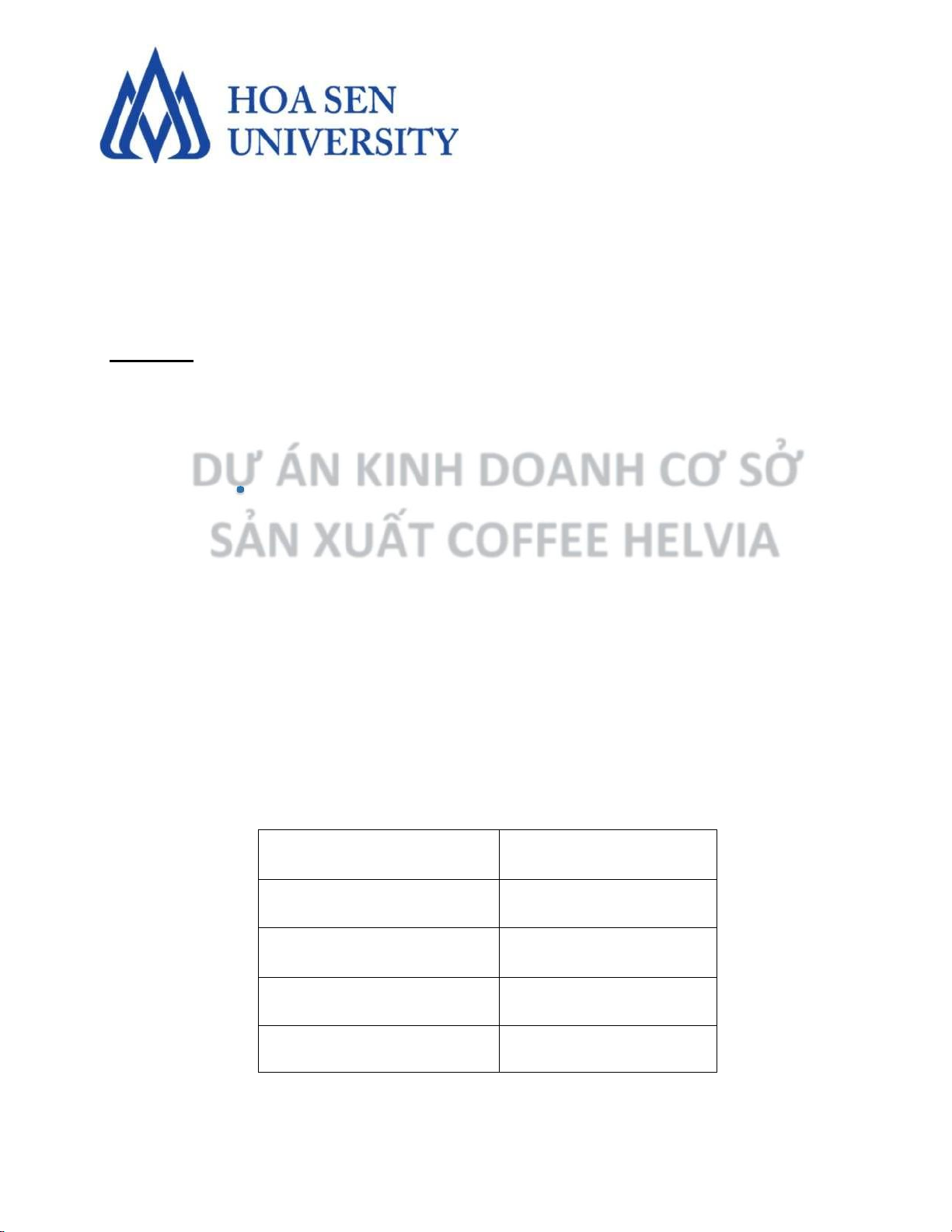BỘ GIÁO DỤC VÀ ĐÀO TẠO TRƯỜNG ĐẠI HỌC HOA SEN KHOA KINH TẾ & QUẢN TRỊ ĐỀ ÁN CUỐI KỲ ĐỀ TÀI: DỰ ÁN KINH DOANH CƠ SỞ SẢN XUẤT COFFEE HELVIA Sinh viên thực hiện: SINH VIÊN MSSV Trần Thảo Vy 22007026 Đoàn Nhật Vy (lớp 2380) 22006388 Lê Triệu Vy 22009630 Lê Trần Khánh Vy 22001199 2 lOMoAR cPSD| 47206417