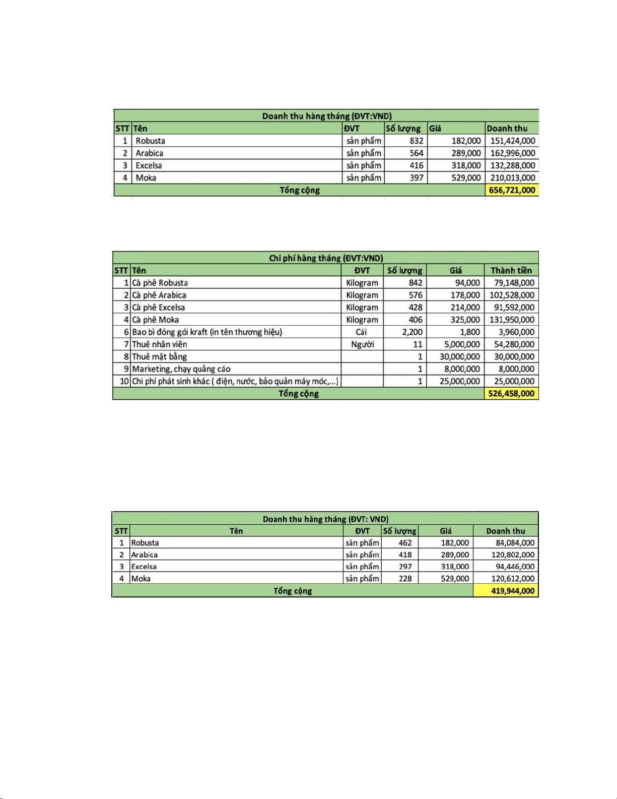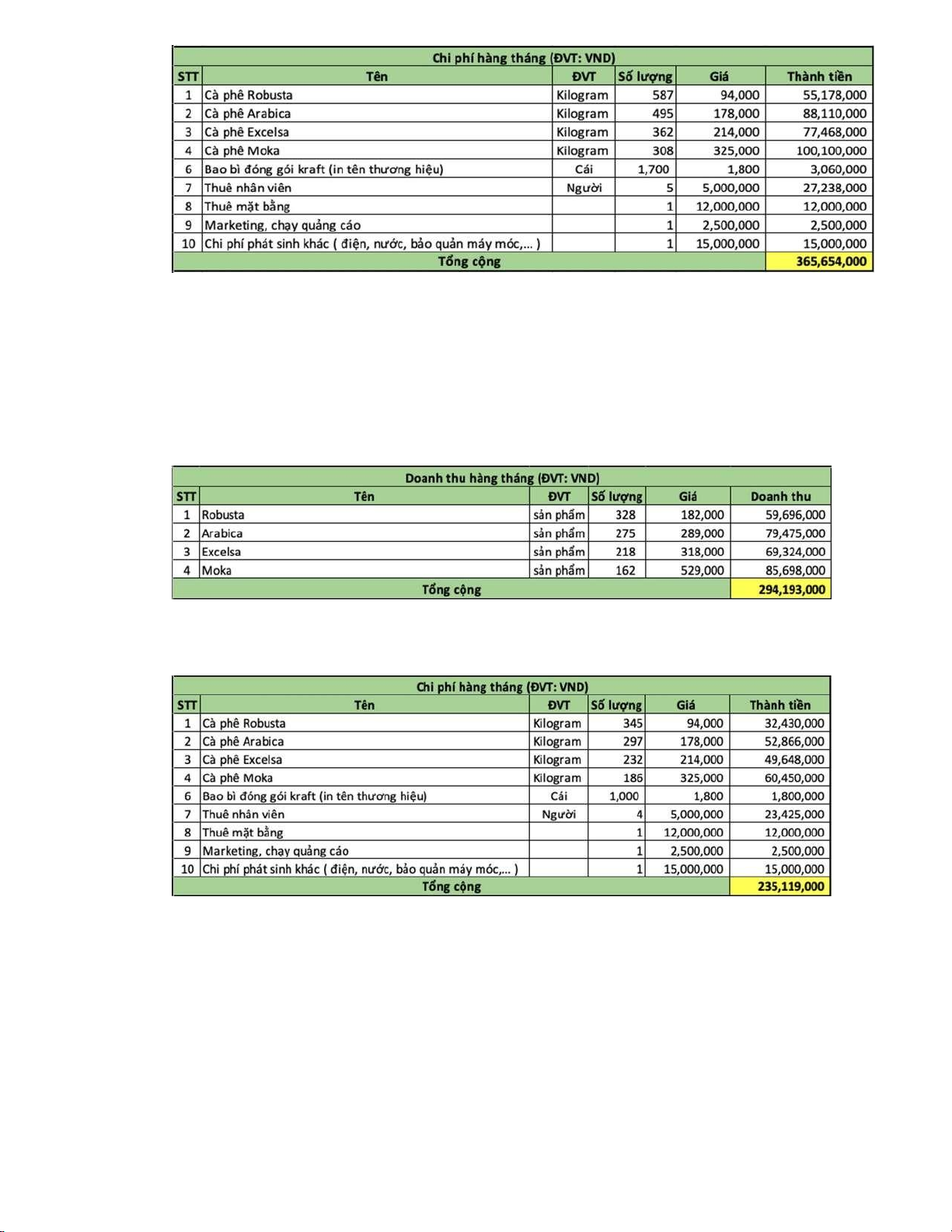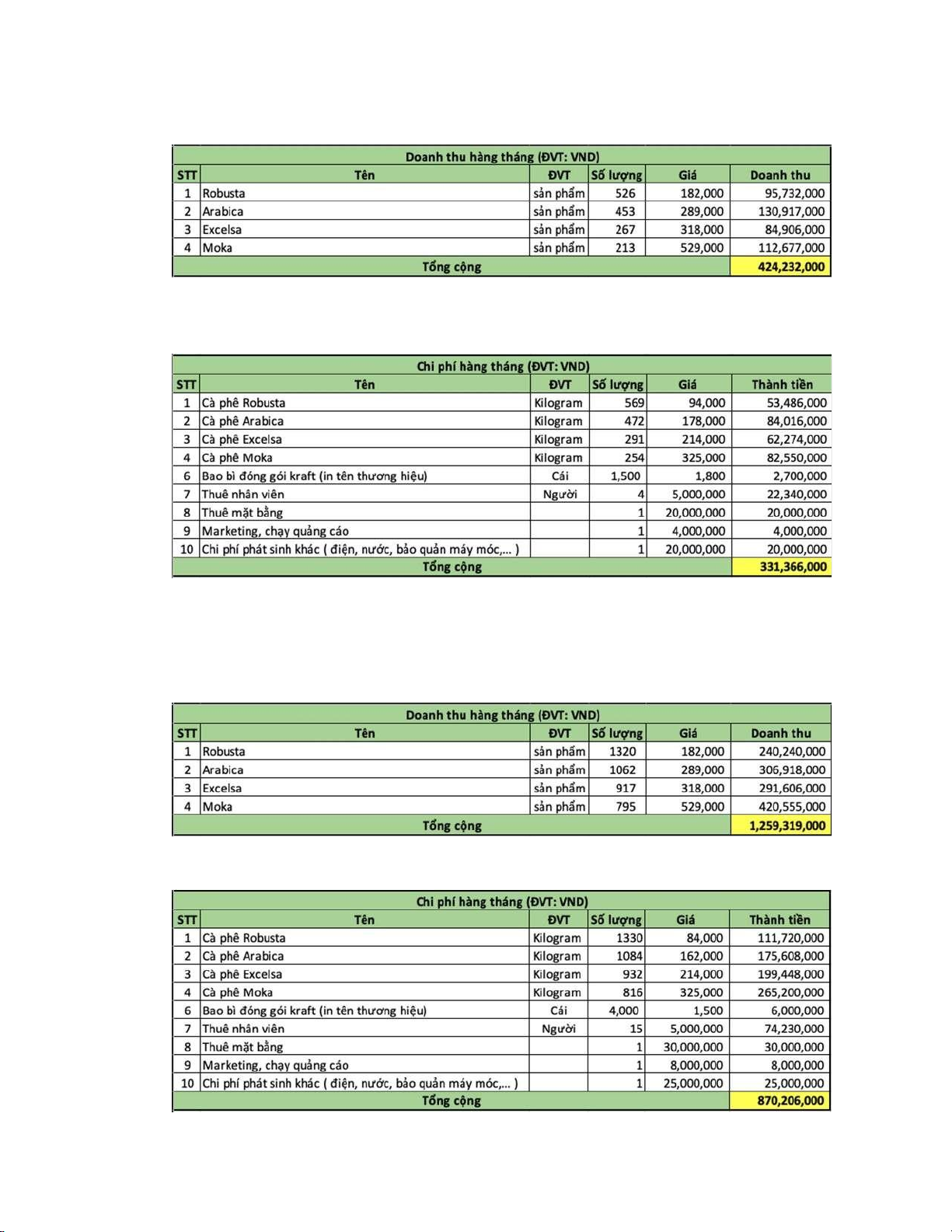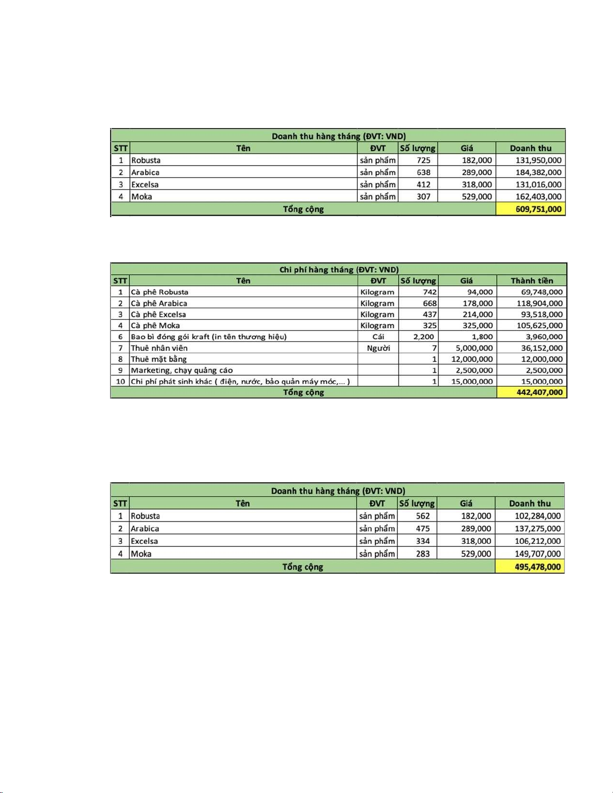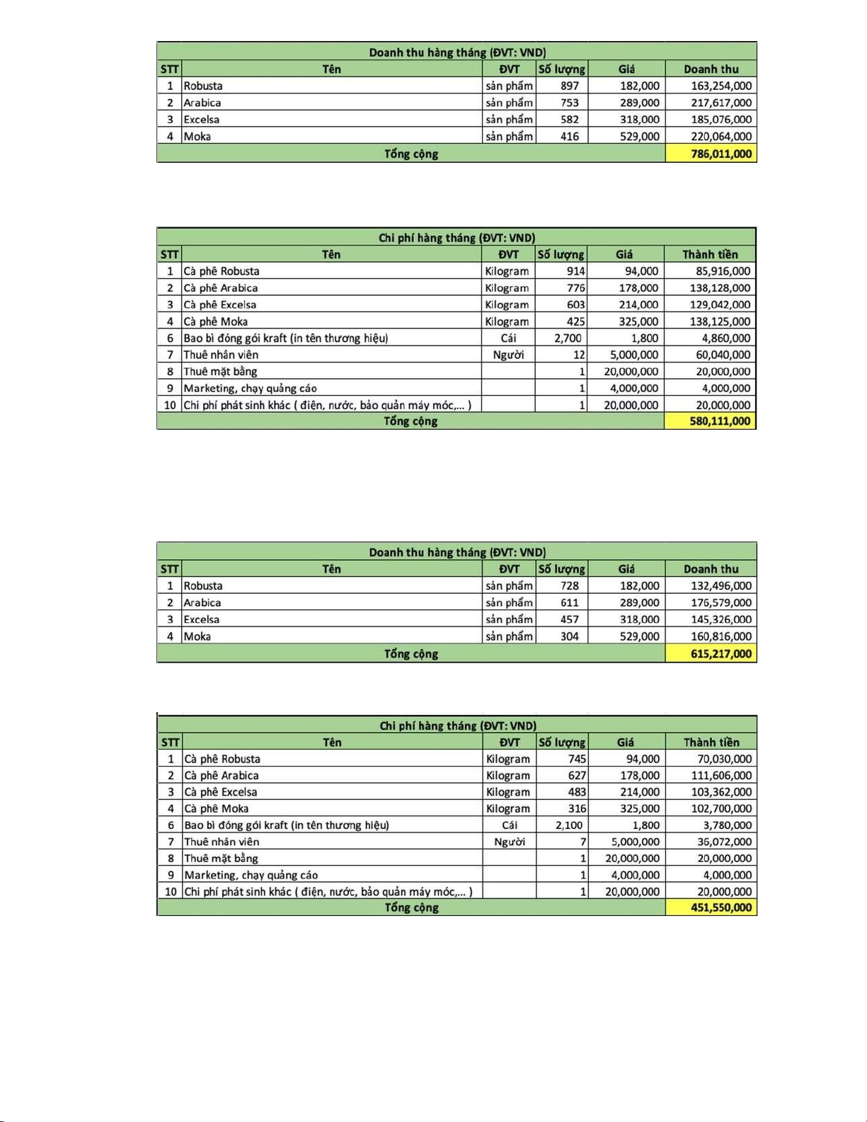 - Nguyên vật liệu: Mỗi sản phẩm cần 1kg cà phê nguyên chất.