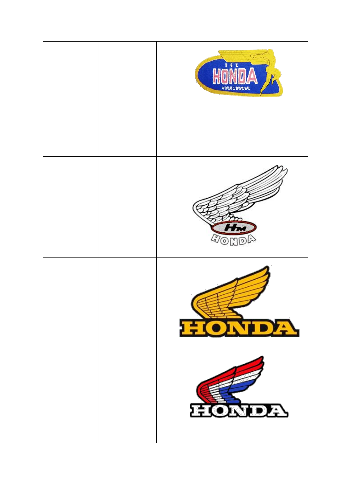 Bảng lịch sử hình thành logo Honda Đặc Hình ảnh Năm điểm 1947 Ông Soichiro sử dụng đôi cánh của Victoria để củng cố các biểu tượng của thương hiệu Honda và thực tế điều này tạo ra sự khởi đầu của cánh trong logo Honda. Trên cánh phải với sự điều chỉnh nhẹ cho 1968 những năm tiếp theo. Thiết kế mở rộng và giớ thiệu 1973 Honda vàng 1985 Một phiên bản mới của các biểu tượng với màu sắc thương hiệu riêng của họ: màu trắng, màu đỏ và màu xanh xuất hiện Trùng với dịp kỷ niệm 40 năm thương hiệu Honda, một thiết kế cánh mới trong logo đã được 1988 - tạo ra để kỷ nay niệm sự kiện đặc biệt này trở thành biểu tượng mà vẫn giữ đến ngày hôm nay