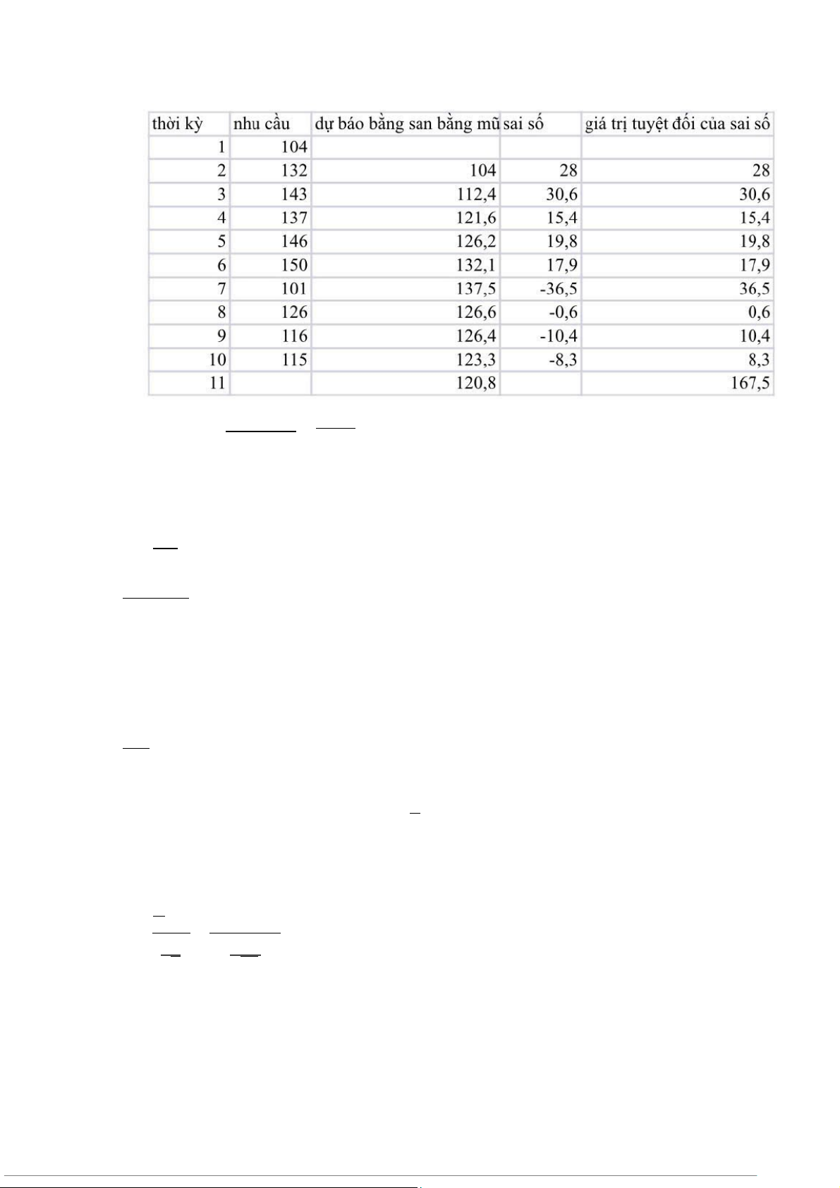 a) Đồ thị cho ta thấy sự thay đổi của nhu cầu qua 10 thời kì b) ∑ |saisố | 167.5 c) MAD = = ≈ 18.61 n 9