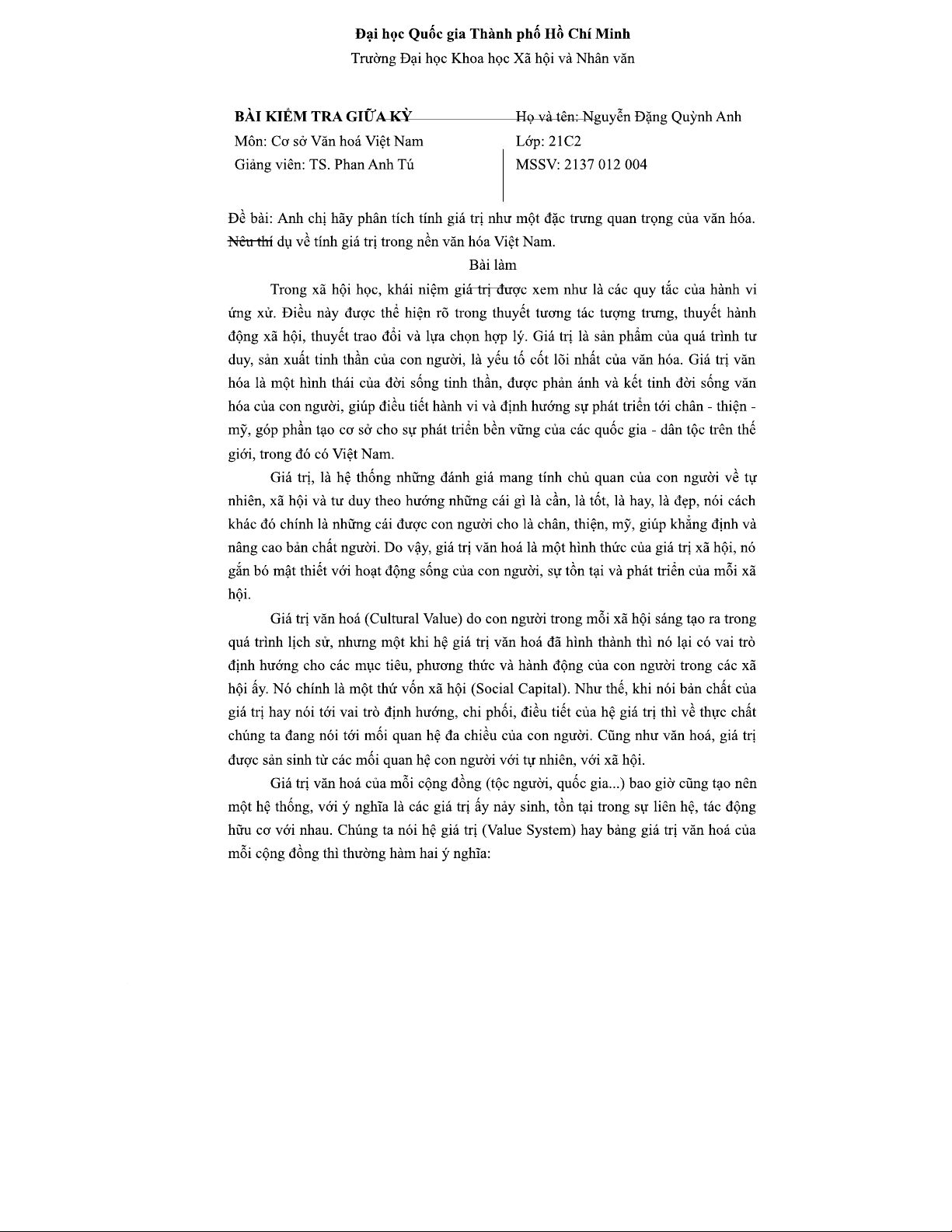 Phân Tích Giá Trị Văn Hóa Việt Nam - Bài Kiểm Tra Giữa Kỳ Cơ sở VHVN