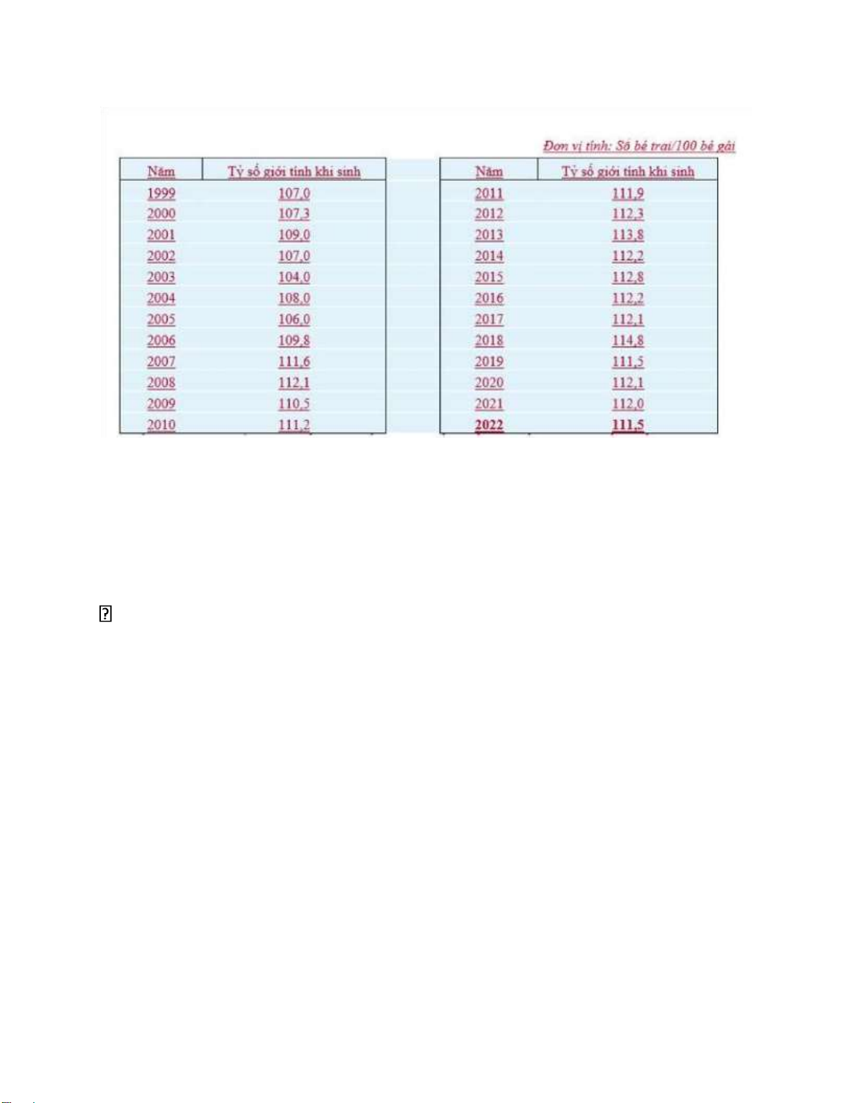 trai/100 bé gái so với 112,0 bé trai/100 bé gái). Dù tỷ số này có