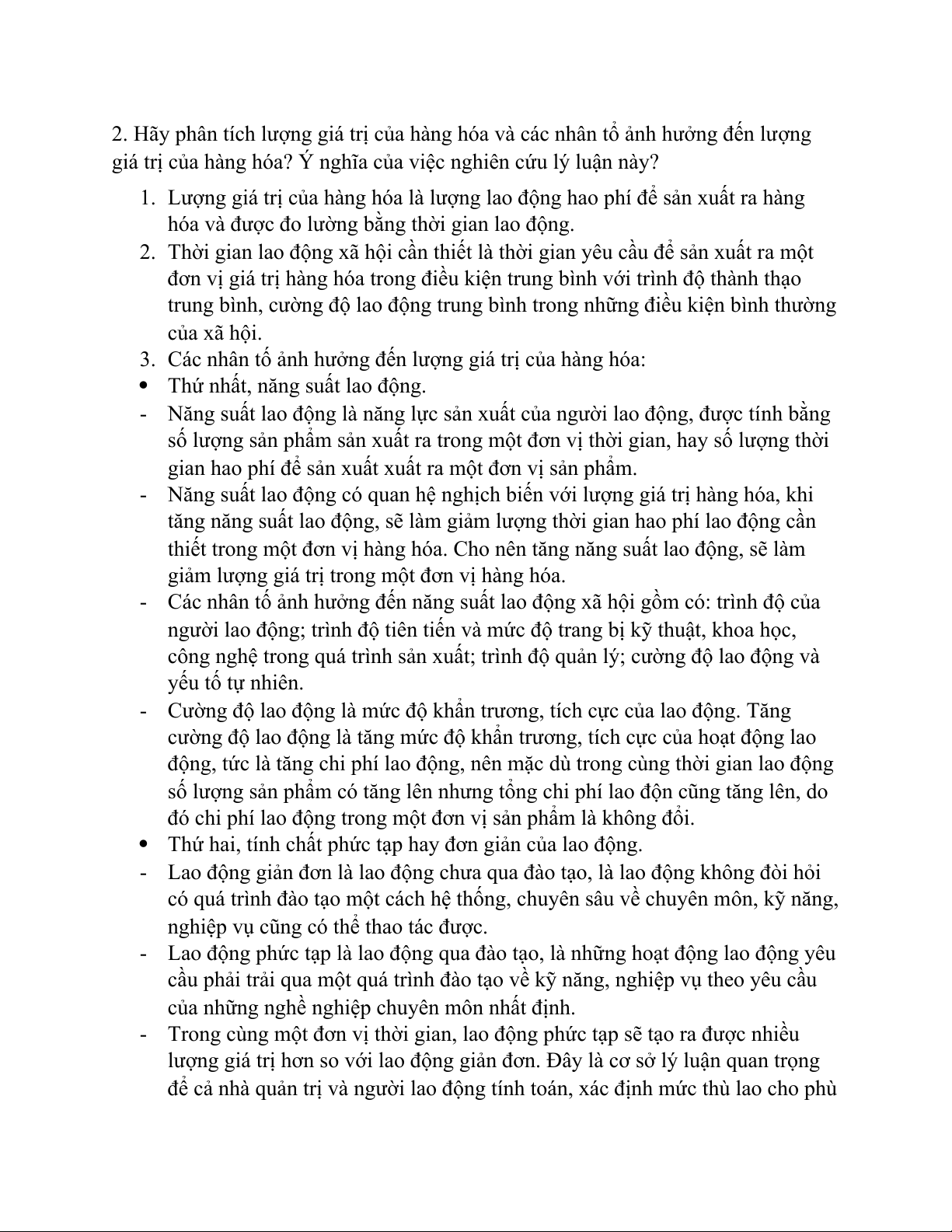 2. Hãy phân tích lượng giá trị của hàng hóa và các nhân tổ ảnh hưởng đến lượng