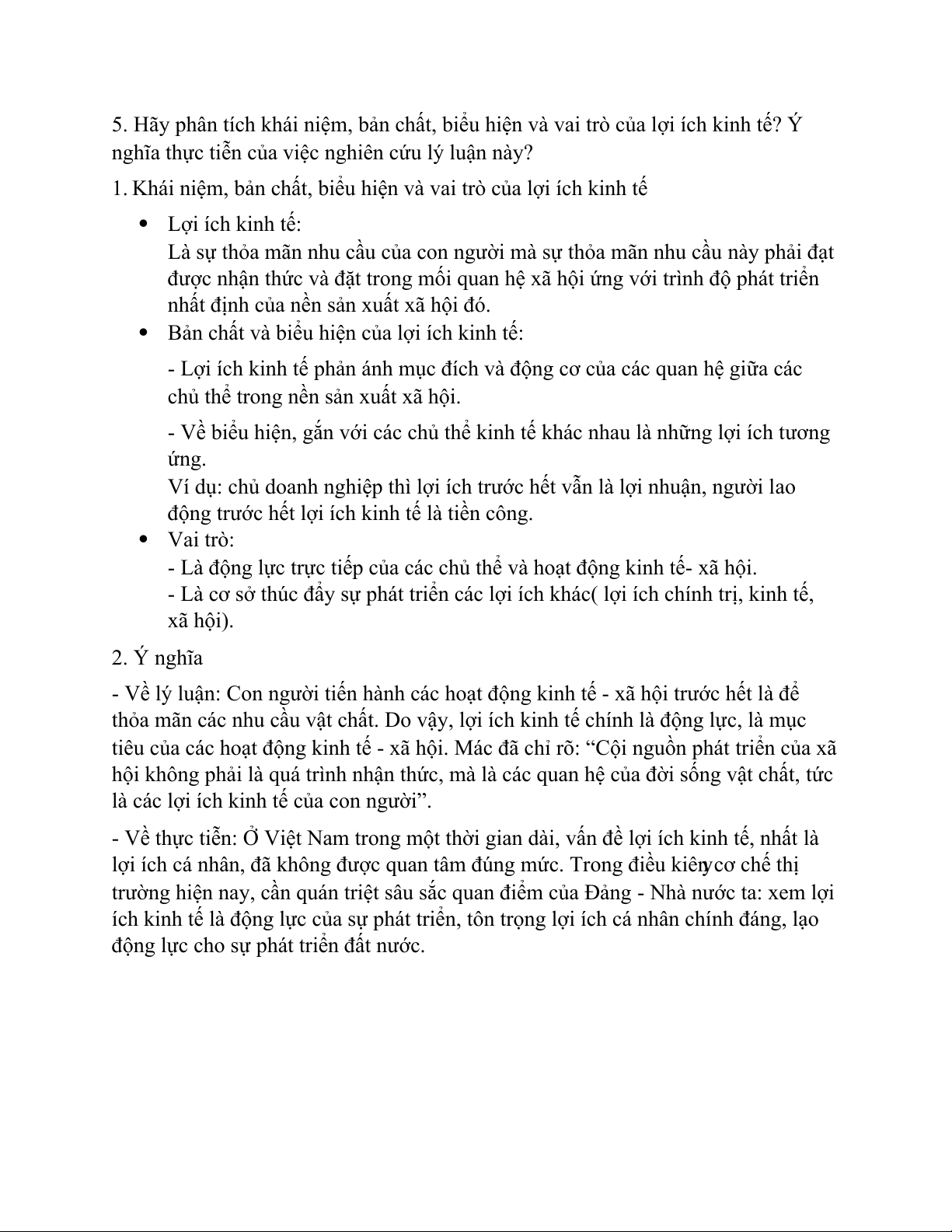 5. Hãy phân tích khái niệm, bản chất, biểu hiện và vai trò của lợi ích kinh tế? Ý