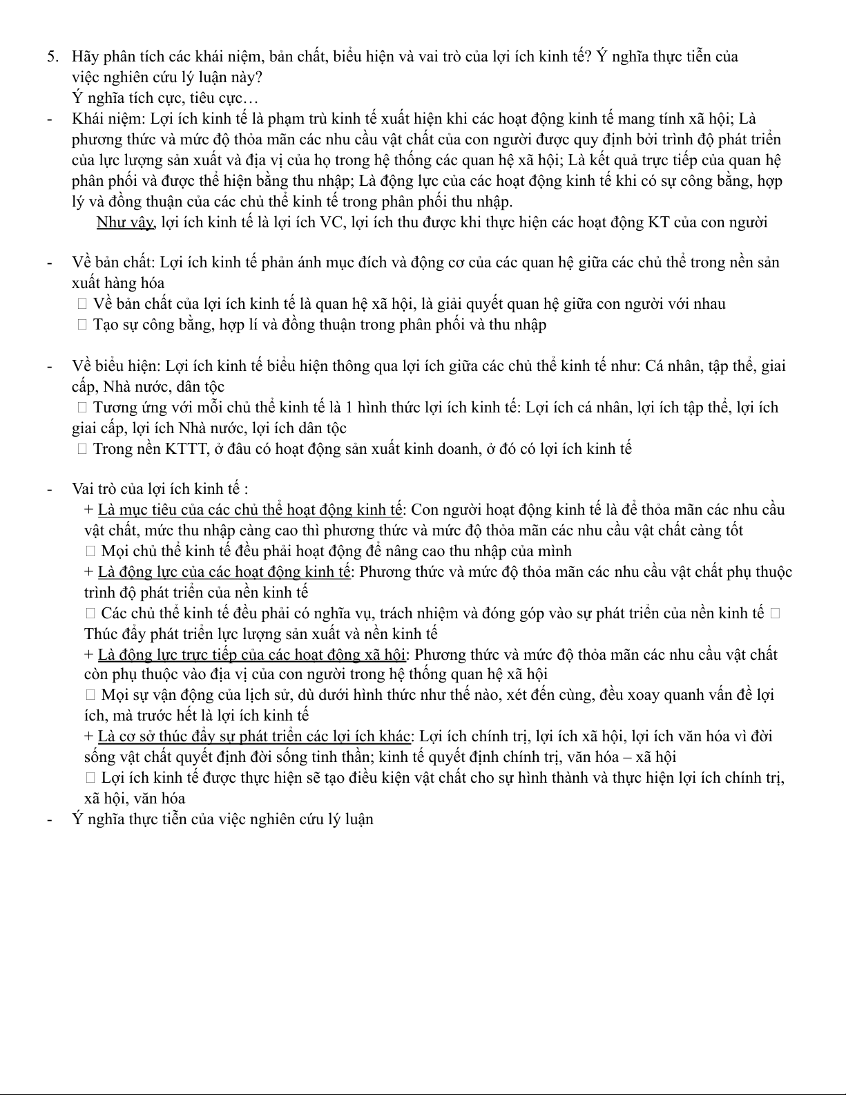 5. Hãy phân tích các khái niệm, bản chất, biểu hiện và vai trò của lợi ích kinh tế? Ý nghĩa thực tiễn của