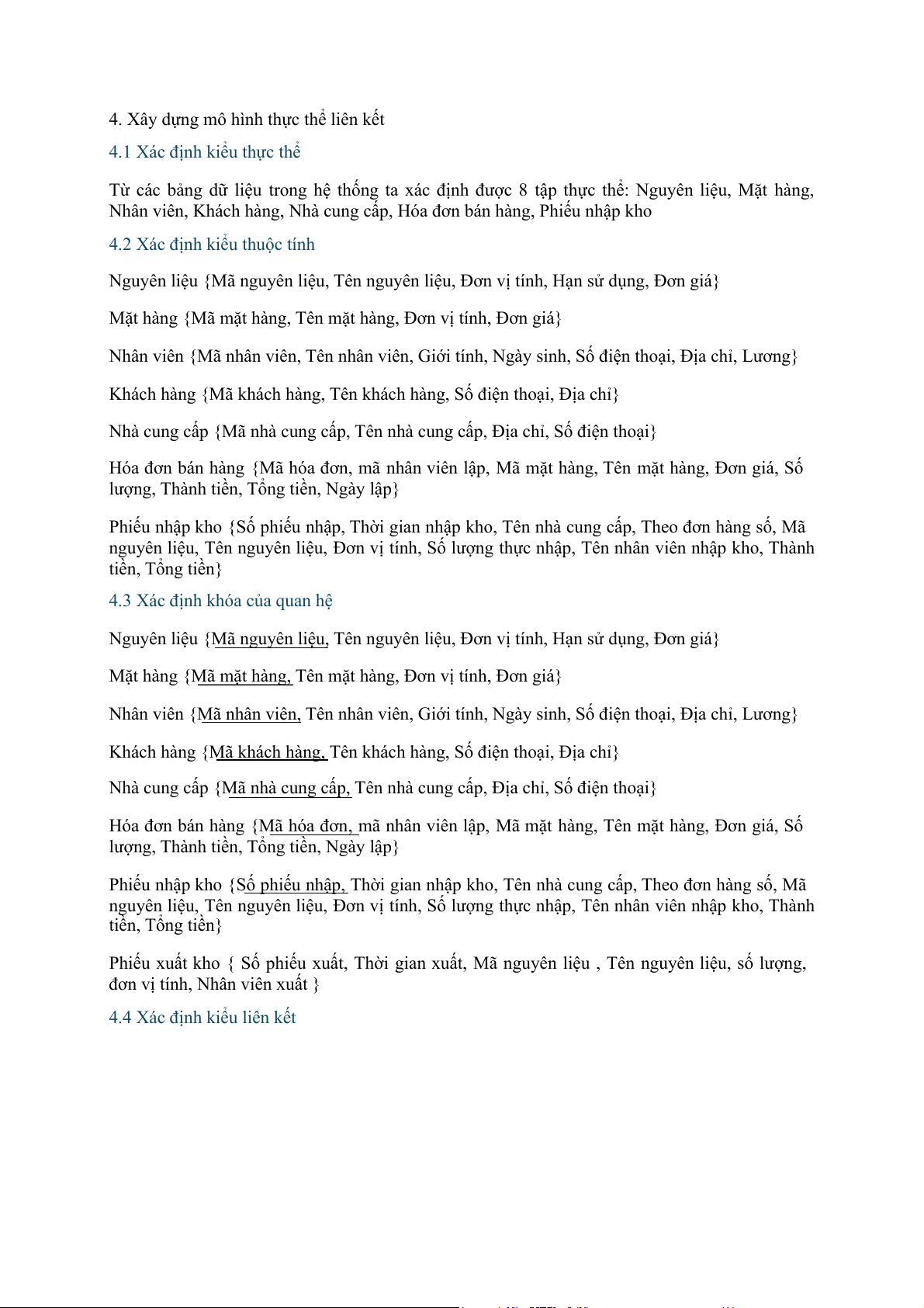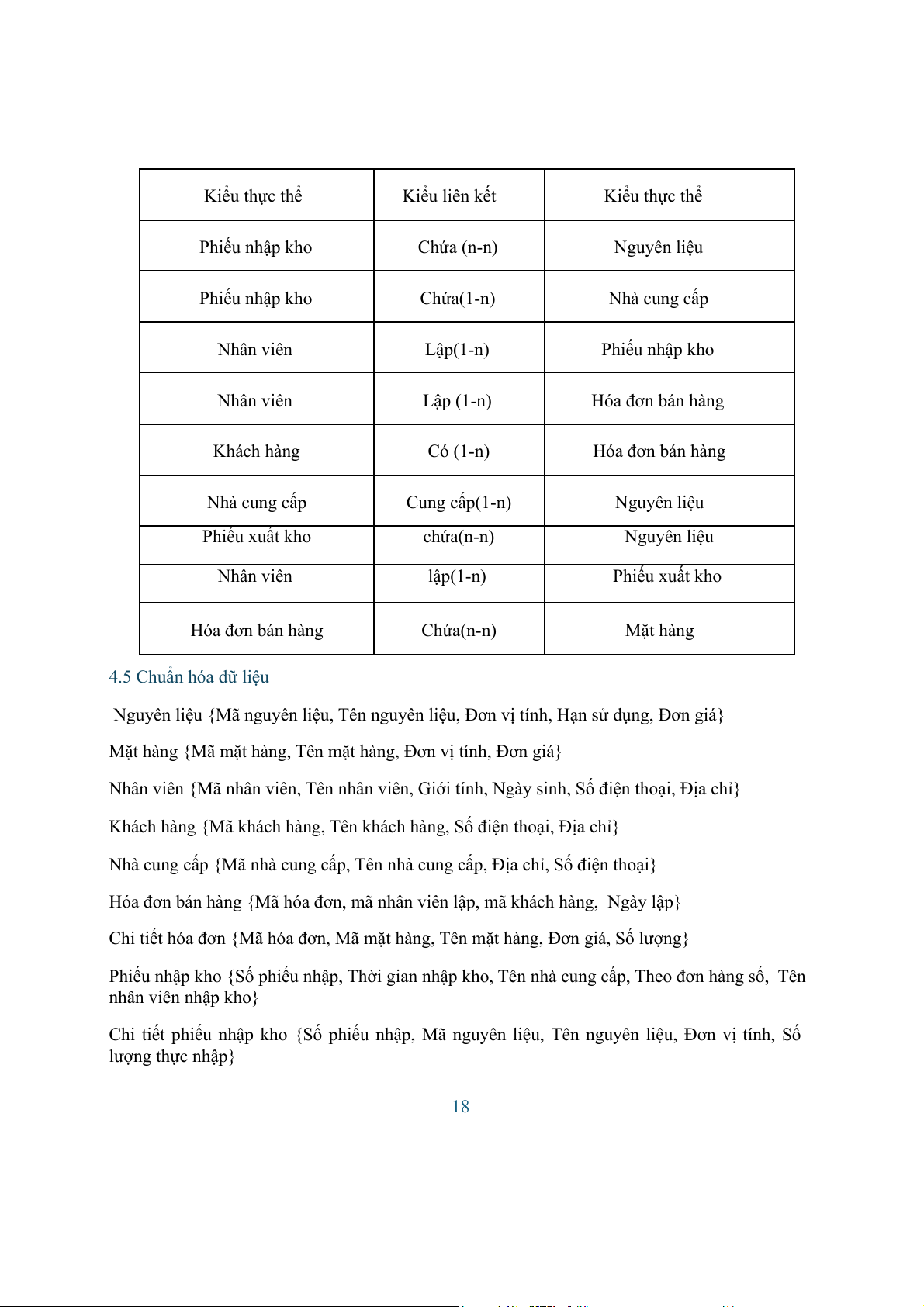 4.4 Xác định kiểu liên kết Kiểu thực thể Kiểu liên kết Kiểu thực thể Phiếu nhập kho Chứa (n-n) Nguyên liệu Phiếu nhập kho Chứa(1-n) Nhà cung cấp Nhân viên Lập(1-n) Phiếu nhập kho Nhân viên Lập (1-n) Hóa đơn bán hàng Khách hàng Có (1-n) Hóa đơn bán hàng Nhà cung cấp Cung cấp(1-n) Nguyên liệu Phiếu xuất kho chứa(n-n) Nguyên liệu Nhân viên lập(1-n) Phiếu xuất kho Hóa đơn bán hàng Chứa(n-n) Mặt hàng 4.5 Chuẩn hóa dữ liệu