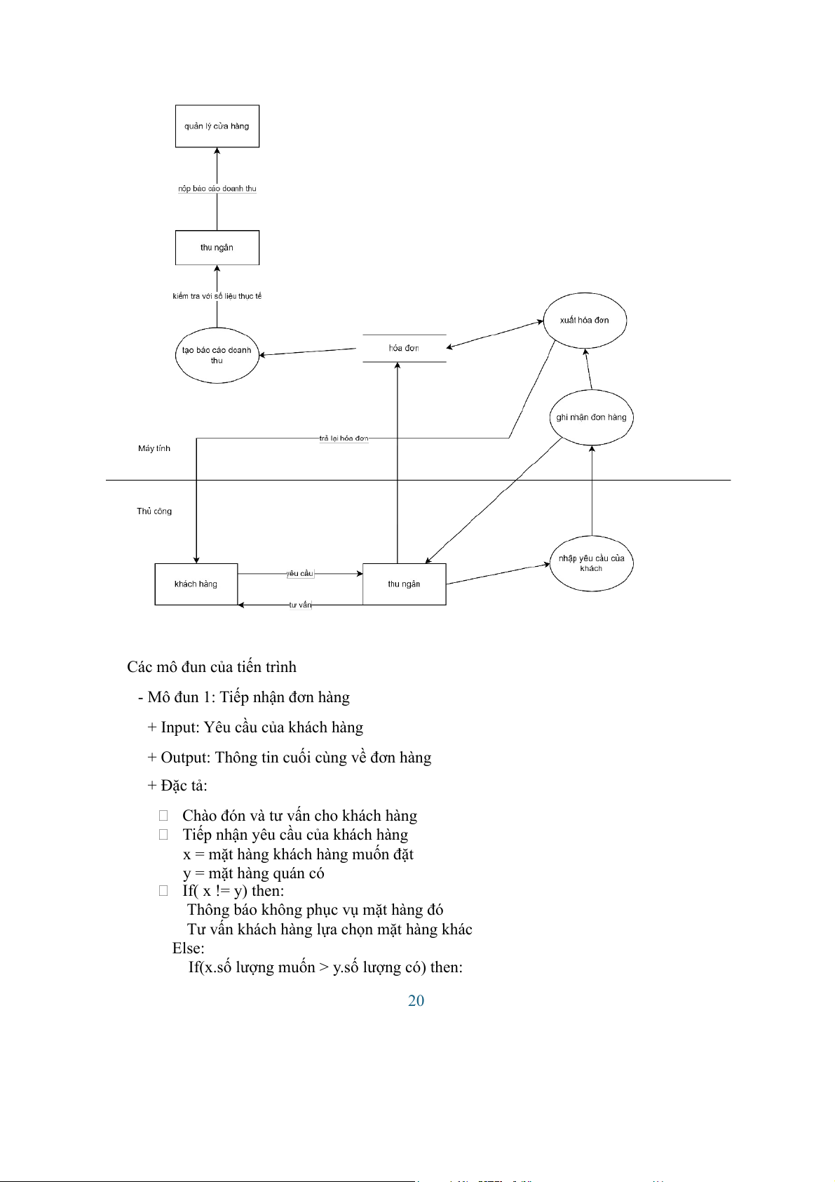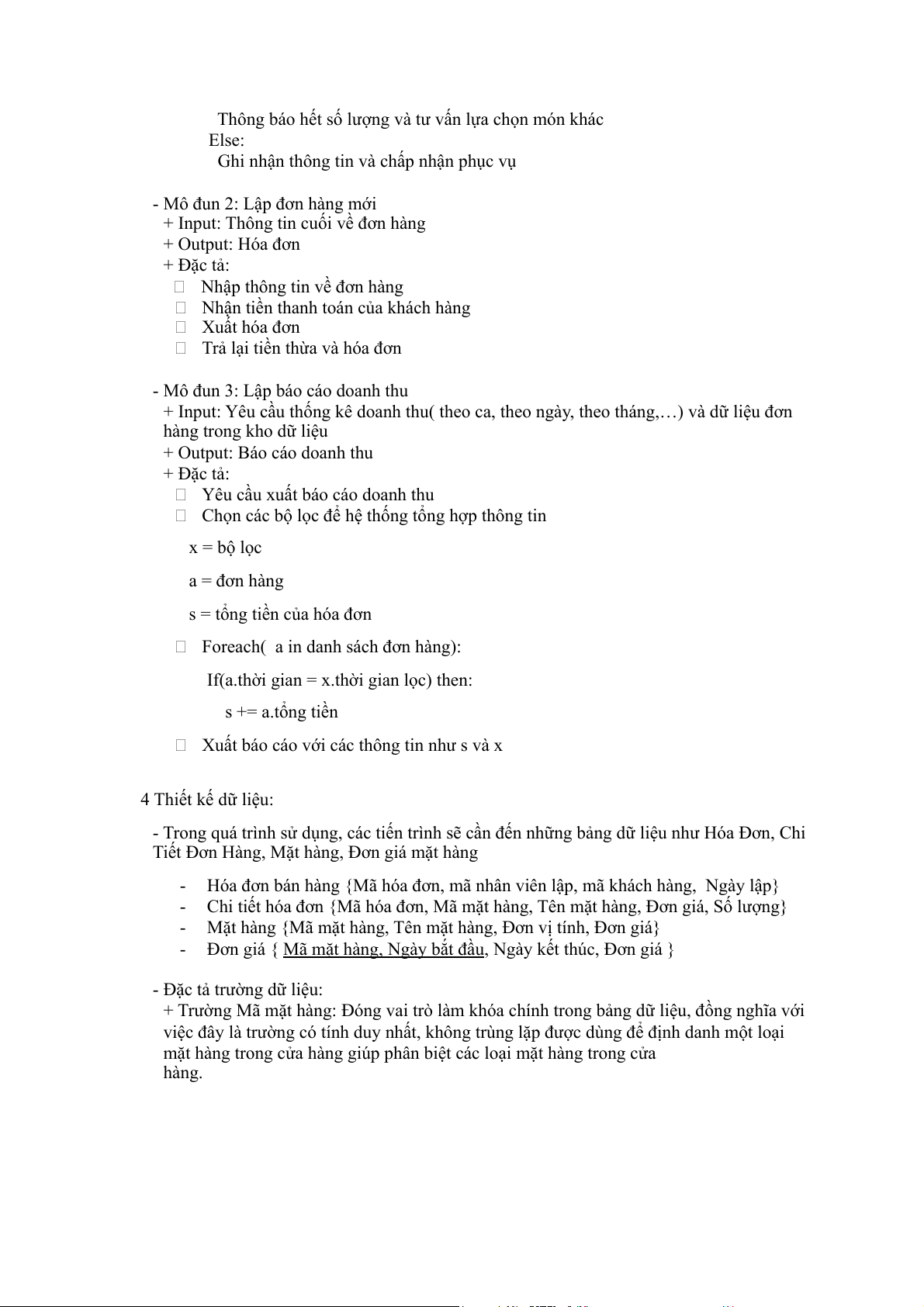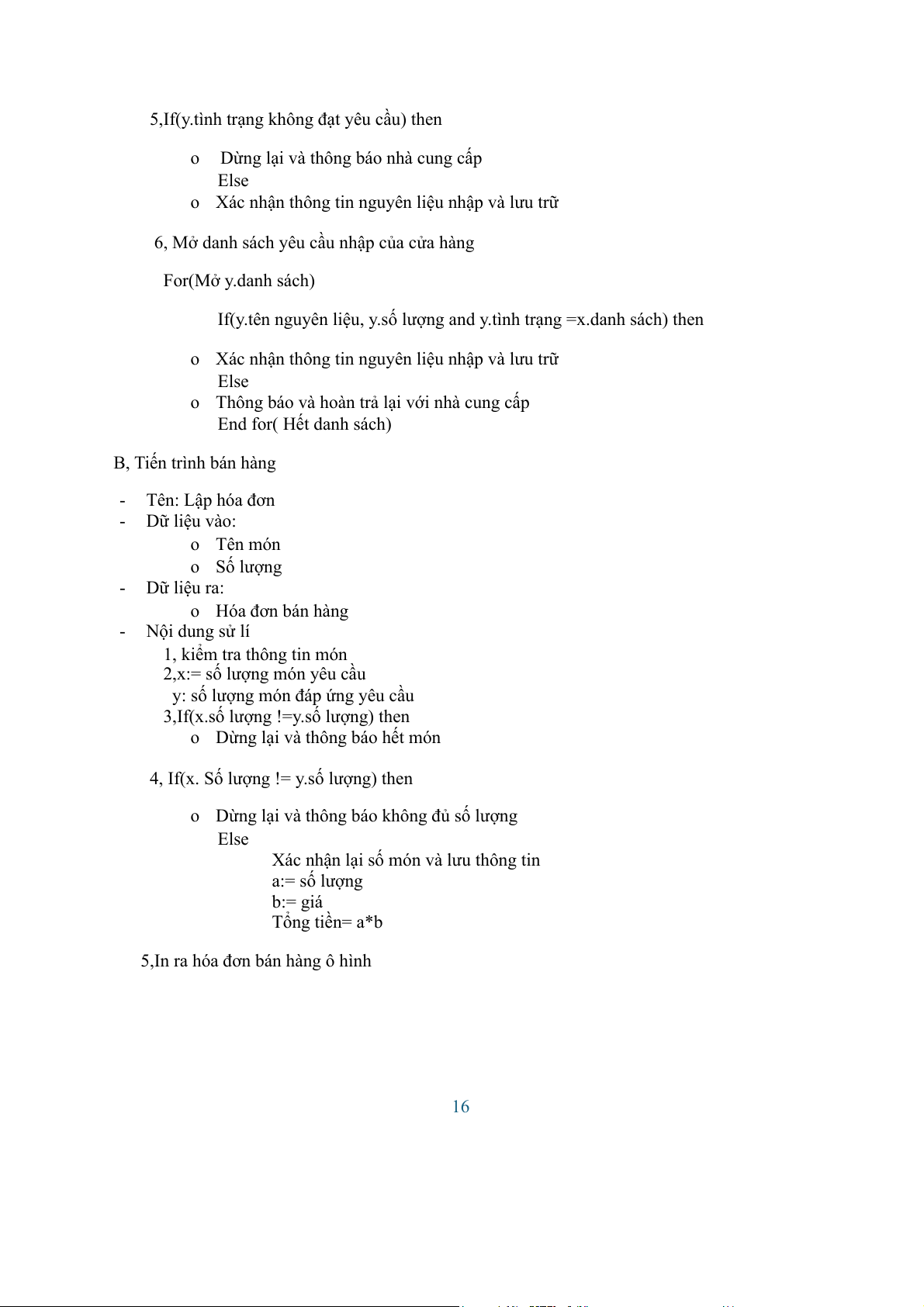 o Thông báo và hoàn trả lại với nhà cung cấp End for( Hết danh sách) B, Tiến trình bán hàng - Tên: Lập hóa đơn - Dữ liệu vào: o Tên món o Số lượng - Dữ liệu ra: o Hóa đơn bán hàng - Nội dung sử lí 1, kiểm tra thông tin món
