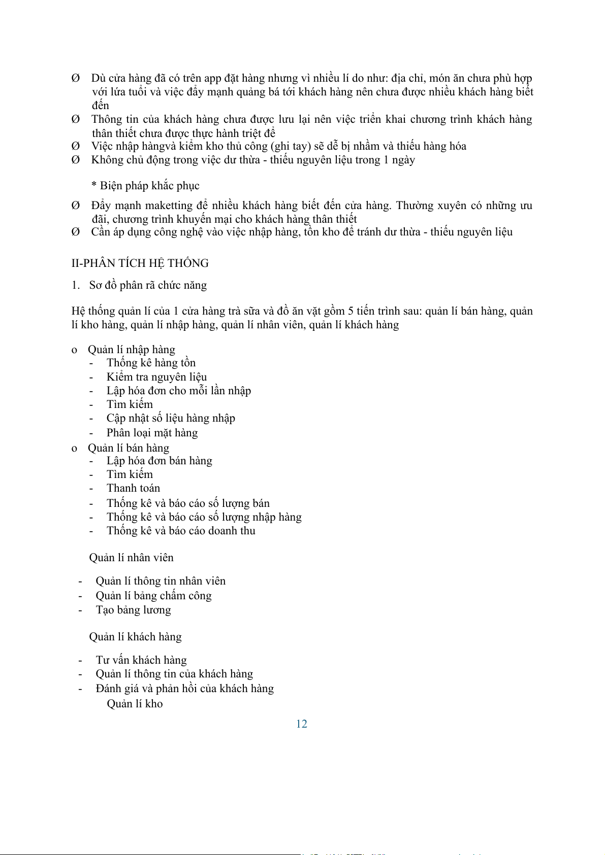 lí kho hàng, quản lí nhập hàng, quản lí nhân viên, quản lí khách hàng o Quản lí nhập hàng - Thống kê hàng tồn - Kiểm tra nguyên liệu -