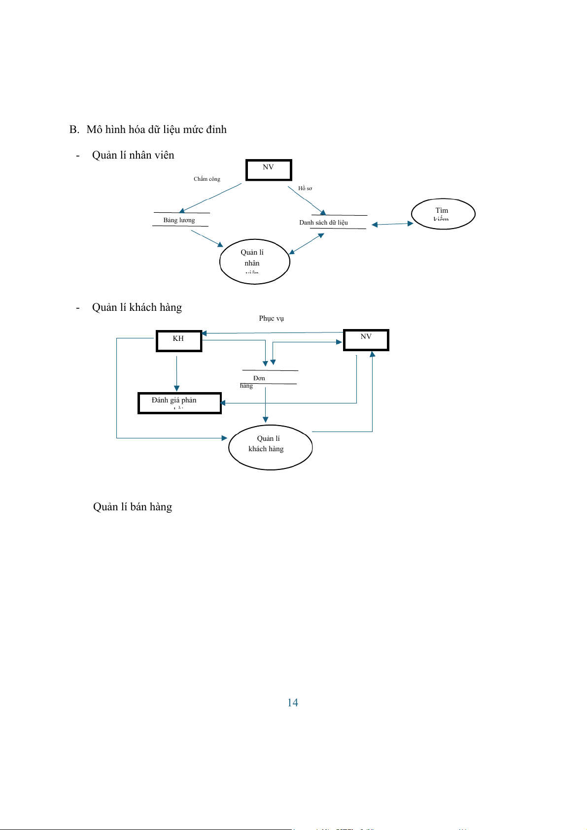 B. Mô hình hóa dữ liệu mức đỉnh - Quản lí nhân viên NV Chấm công Hồ sơ Tìm Bảng lương Danh sách dữ liệu kiếm Quản lí nhân viên - Quản lí khách hàng Phục vụ NV KH Đơn hàng Đánh giá phản hồi Quản lí khách hàng Quản lí bán hàng 14 Đánh giá của KH Thanh toán Nhu cầu mua hàng Nhu cầu đáp ứng Thông tin nguyên Ccsdl KH KH Lập HĐ liêu csdl kho Yêu cầu mua DL Kho Yêu cầu tư vấn Hóa đơn bán I Tư vấn KH Ki Thông tin yêu ểm tr cầu a