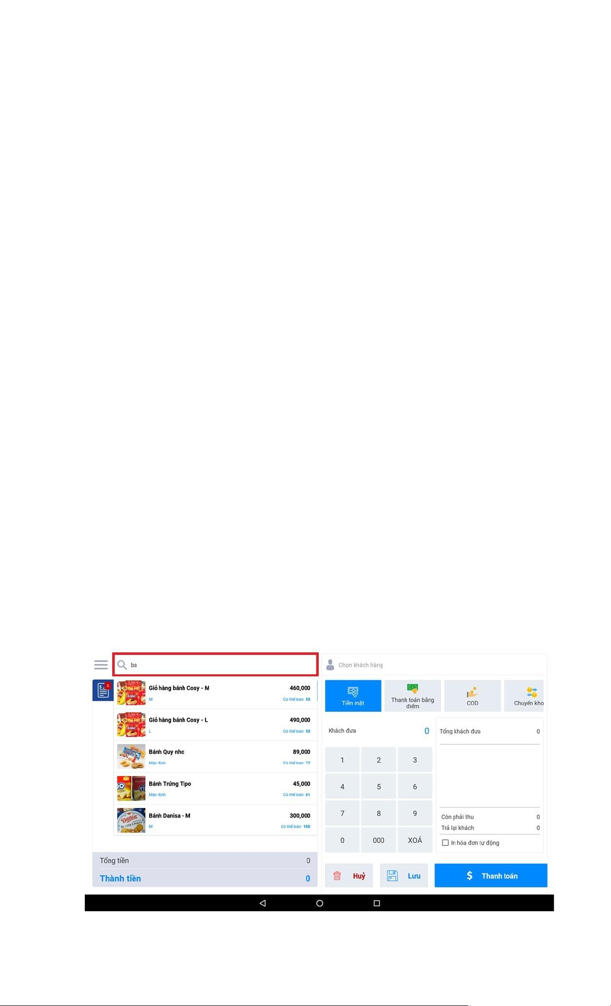 Khi dùng máy quét mã vạch để chọn sản phẩm bạn không cần trỏ chuột vào ô “Tìm kiếm sản