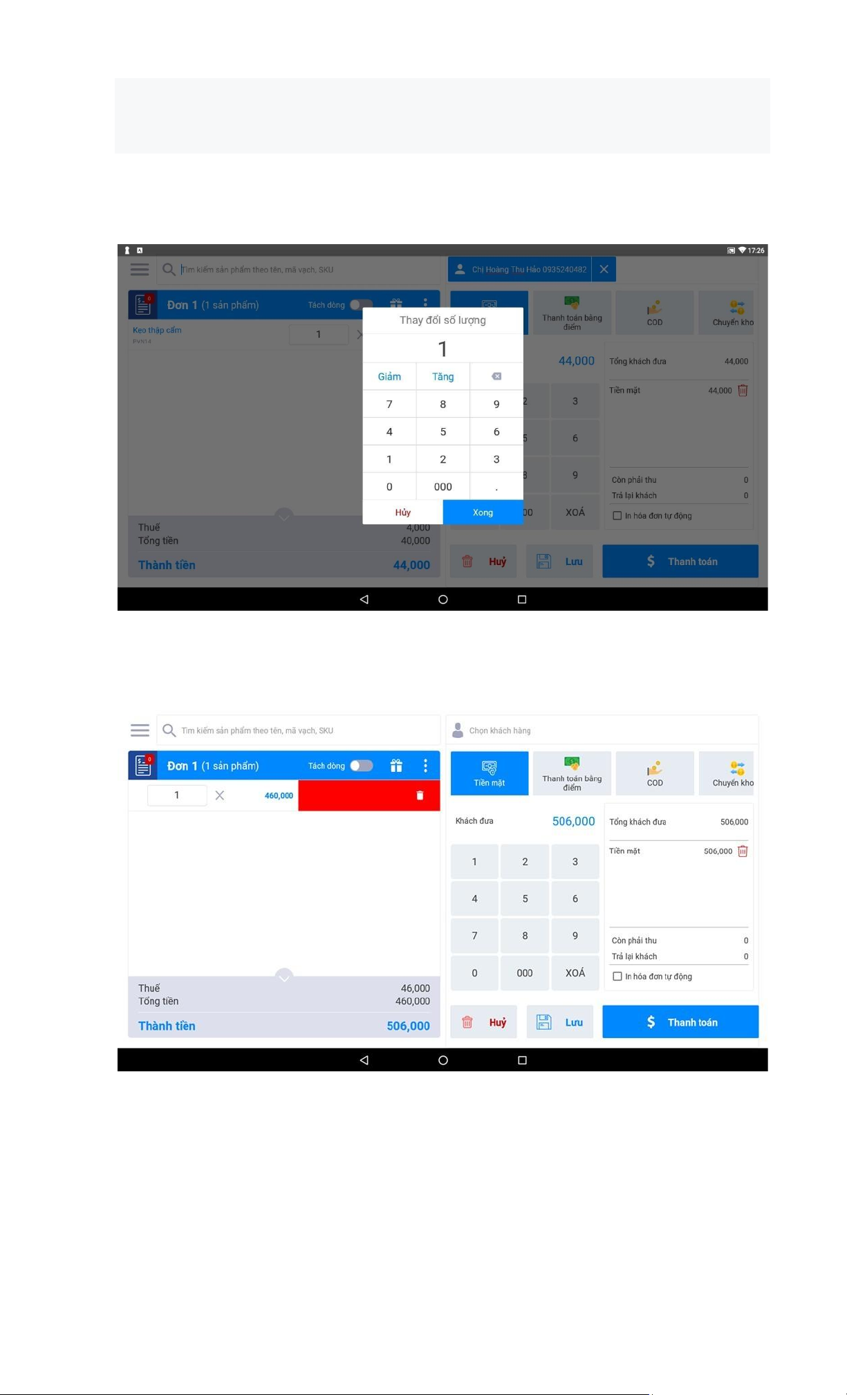 Bạn có thể thay đổi số lượng mặt hàng trực tiếp trong đơn hàng bằng cách click vào ô vuông số