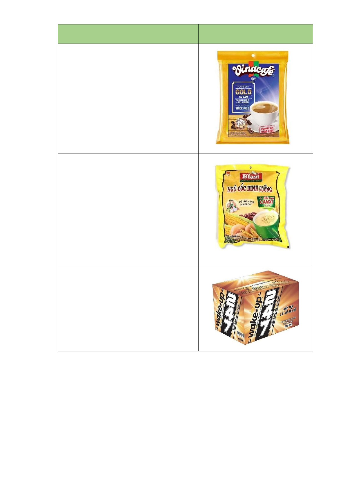 8. Sản lượng tiêu thụ Triệu gói + Cà phê hòa tan 3in1 3.523 3.975 4.000 + Ngũ cốc B’fast 2.593 2.562 3.511 9. Giá bán Nghìn đồng/ gói + Cà phê hòa tan 3in1 7 7,5 8 + Ngũ cốc B’fast 4 3,5 5
