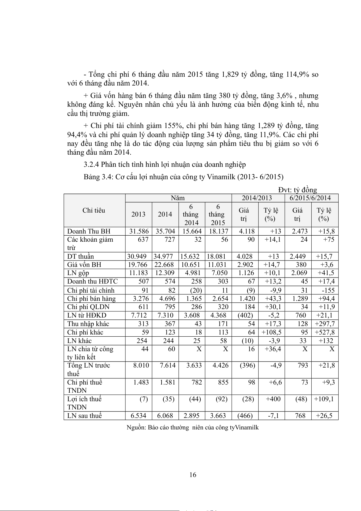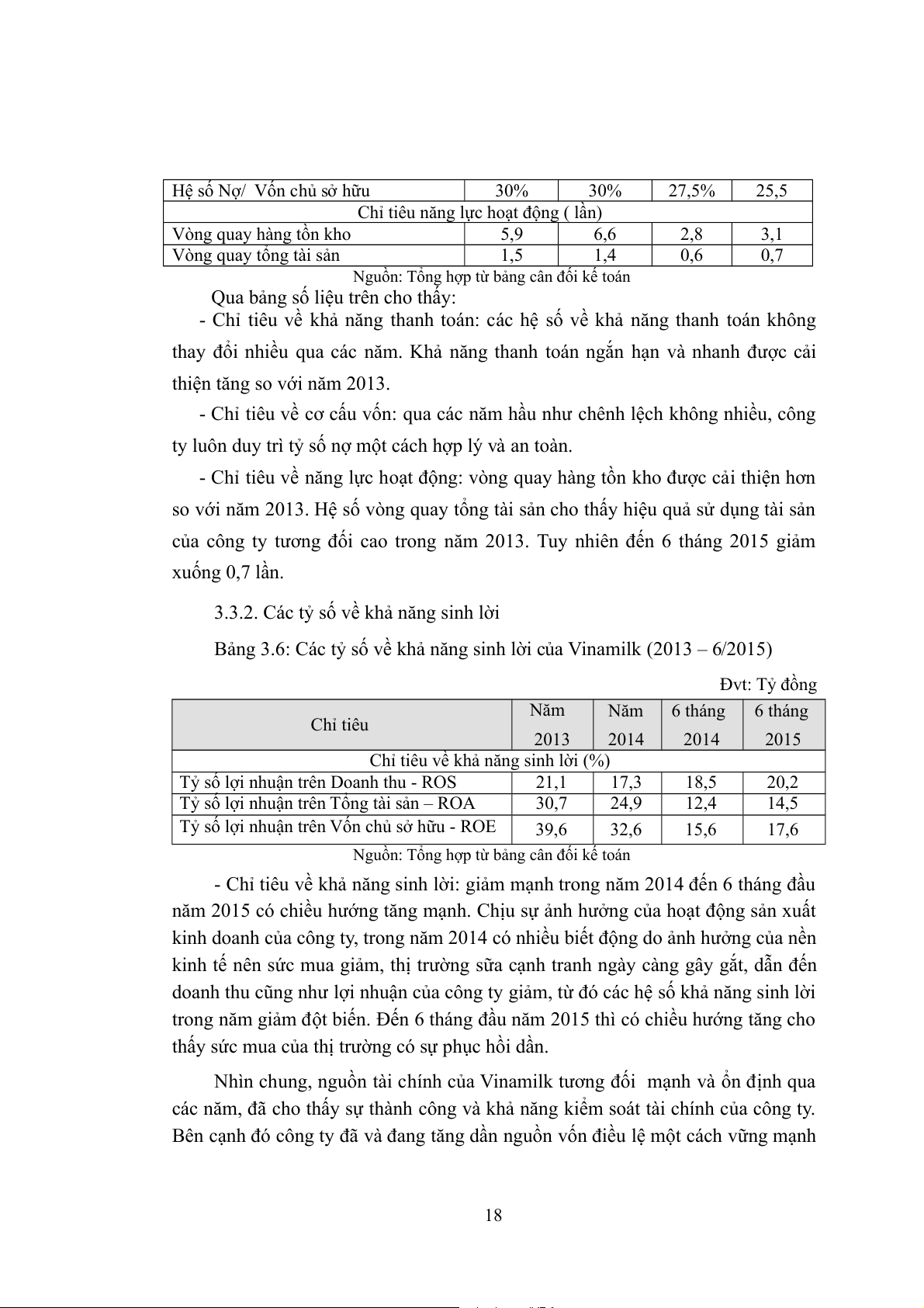 Bảng 3.6: Các tỷ số về khả năng sinh lời của Vinamilk (2013 – 6/2015) Đvt: Tỷ đồng Năm Năm 6 tháng 6 tháng Chỉ tiêu 2013 2014 2014 2015