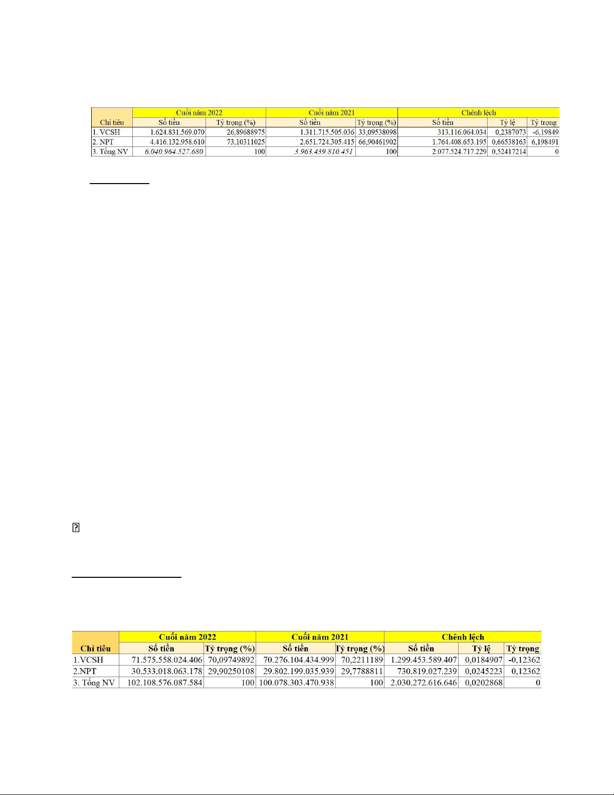 tỷtrọng này chiếm 73,10%/Tổng nguồn vốn. Cuối năm 2022 so với cuối năm 202,