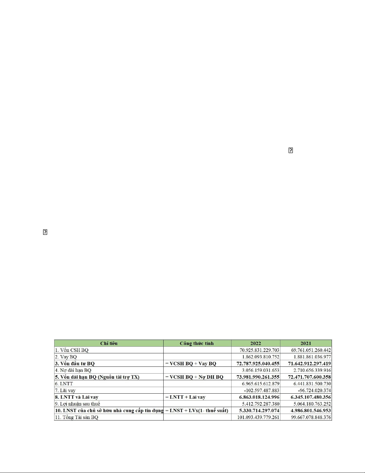 * Các công thức tính chỉ tiêu trong bảng: