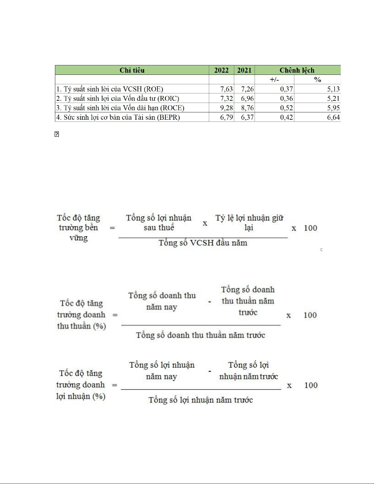 1. Tốc độ tăng trưởng bền vững (%) 36,32589551 37,42455793 -1,098662421