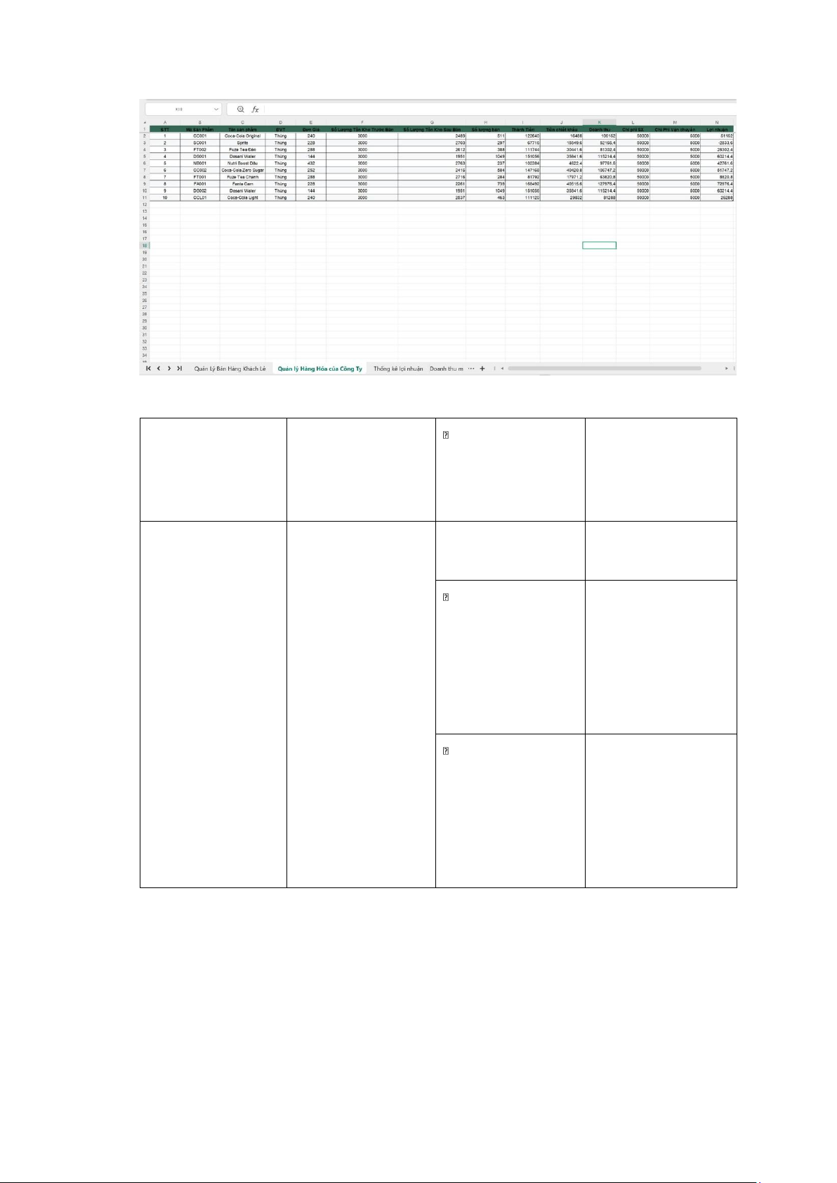 Hình 6: Sheet Quản lý Hàng Hóa của Công Ty 3 Thống kê lợi Tổng Doanh nhuận thu (A2) =SUM('Quản lý Hàng Hóa của Công Ty'! K2:K11)