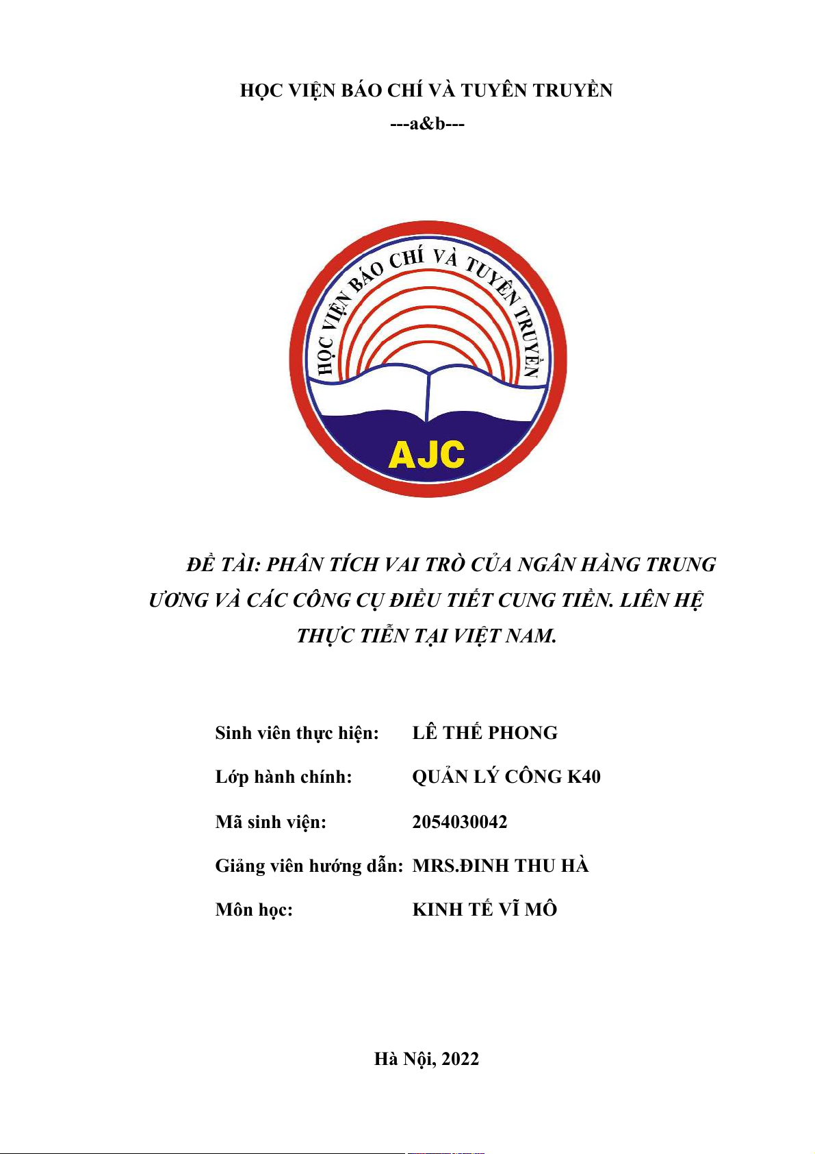 ĐỀ TÀI: PHÂN TÍCH VAI TRÒ CỦA NGÂN HÀNG TRUNG