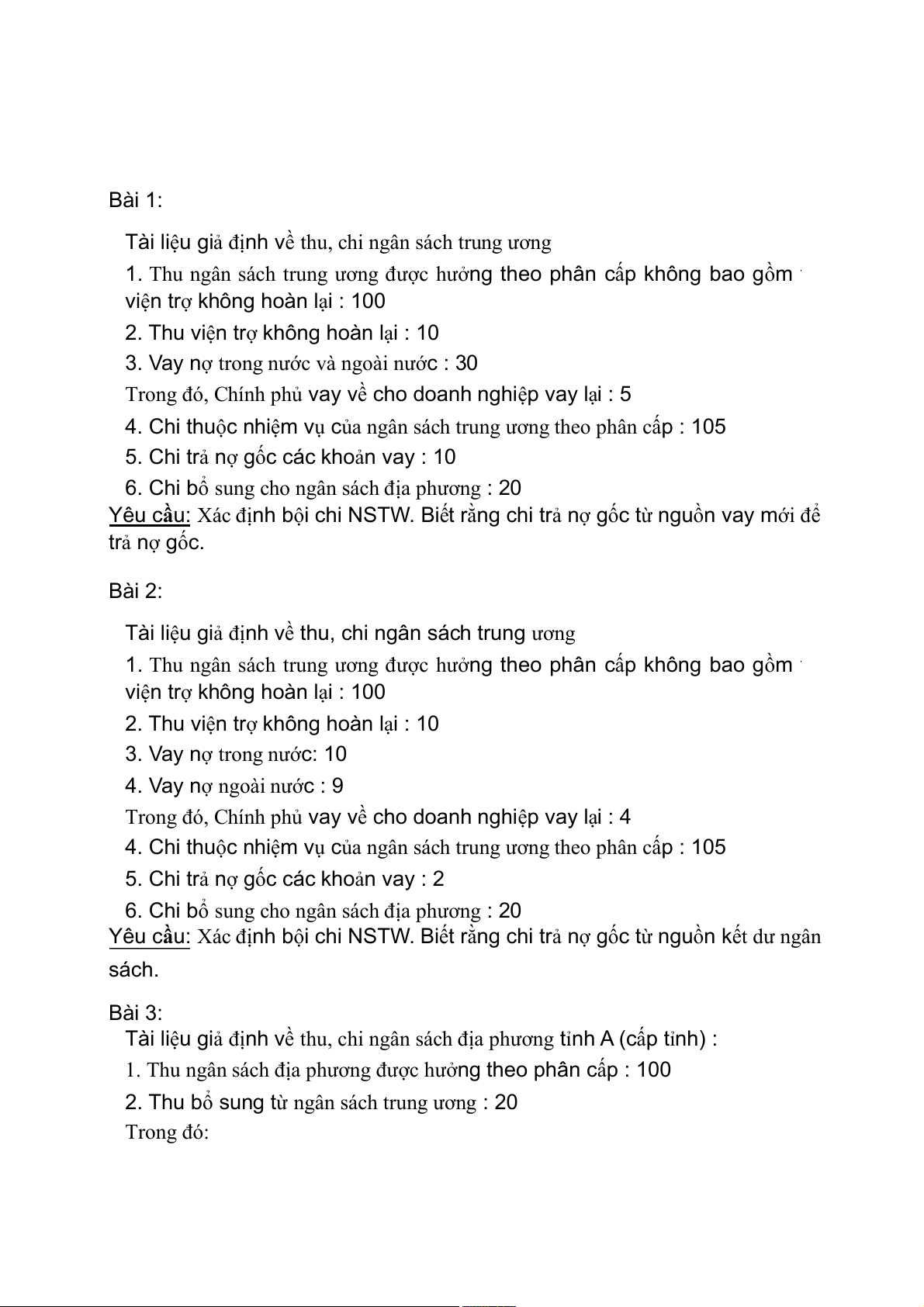 Yêu cầu: Xác định bội chi NSTW. Biết rằng chi trả nợ gốc từ nguồn vay mới để trả nợ gốc. Bài 2: