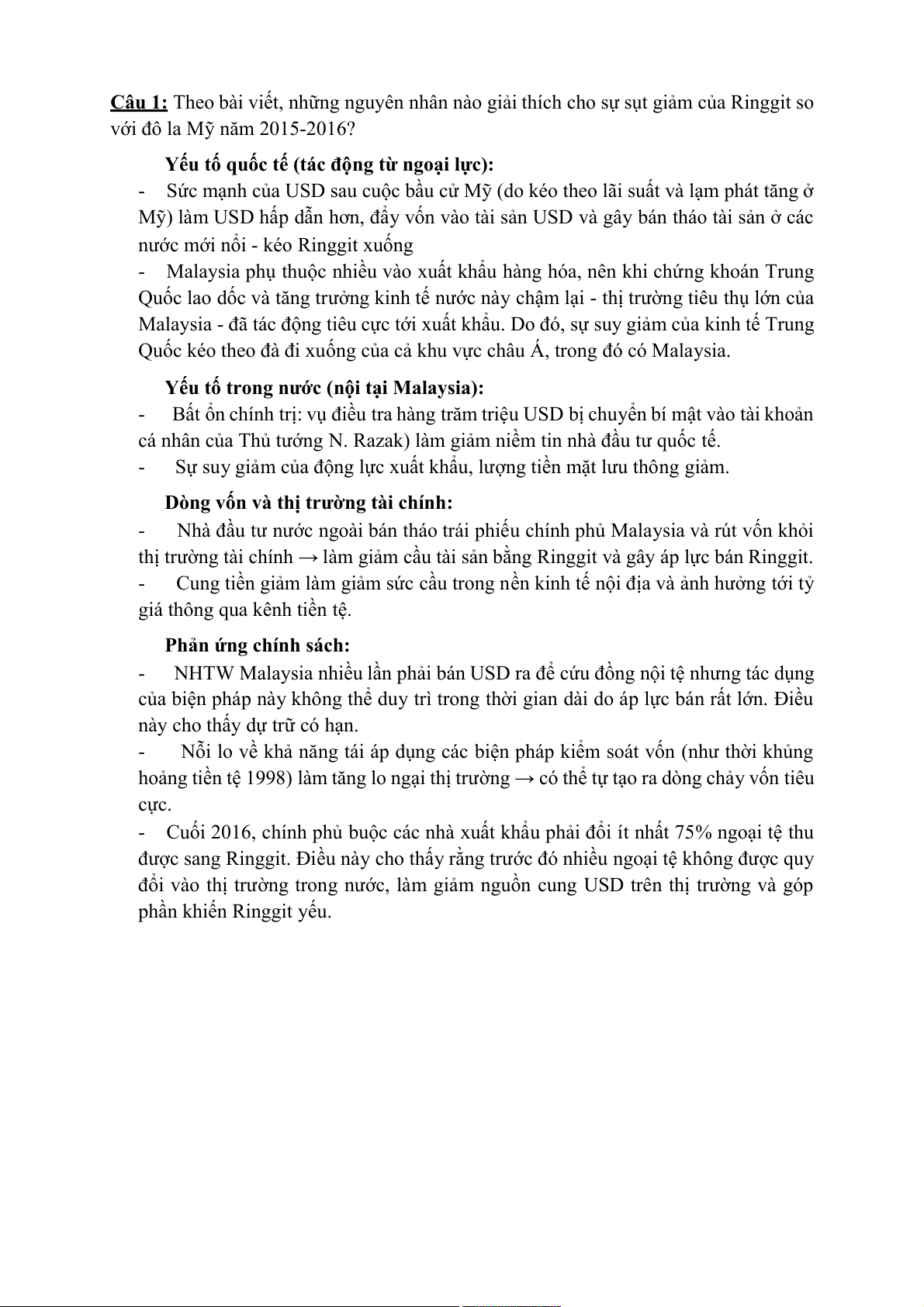 Câu 1: Theo bài viết, những nguyên nhân nào giải thích cho sự sụt giảm của Ringgit so