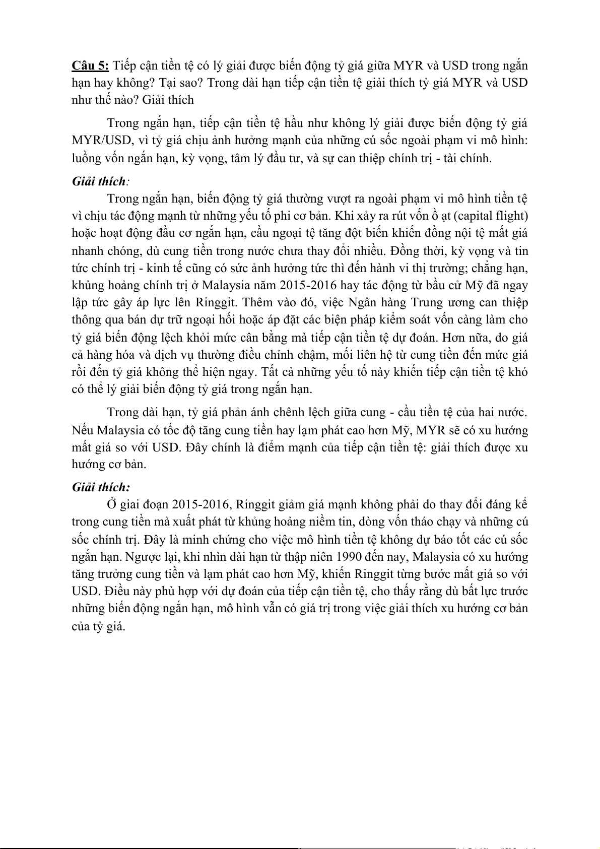 Câu 5: Tiếp cận tiền tệ có lý giải được biến động tỷ giá giữa MYR và USD trong ngắn