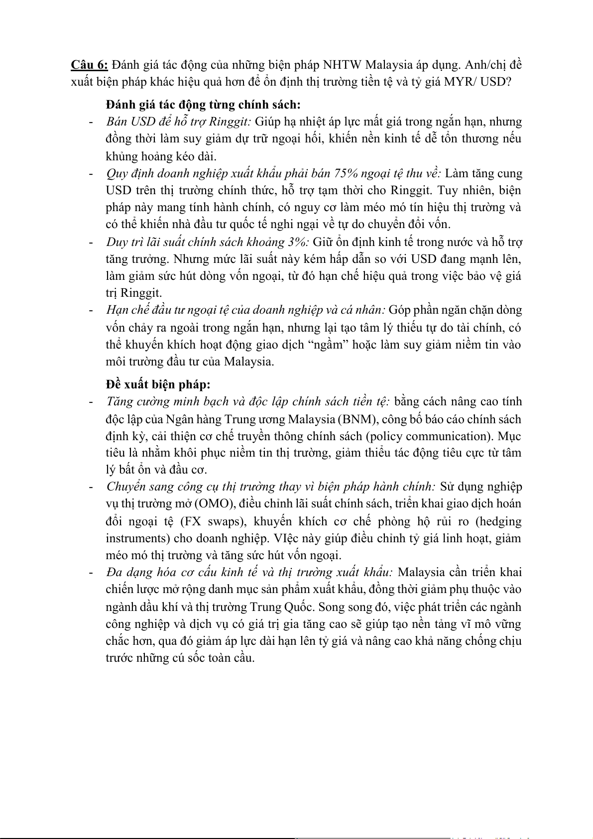 Câu 6: Đánh giá tác động của những biện pháp NHTW Malaysia áp dụng. Anh/chị đề