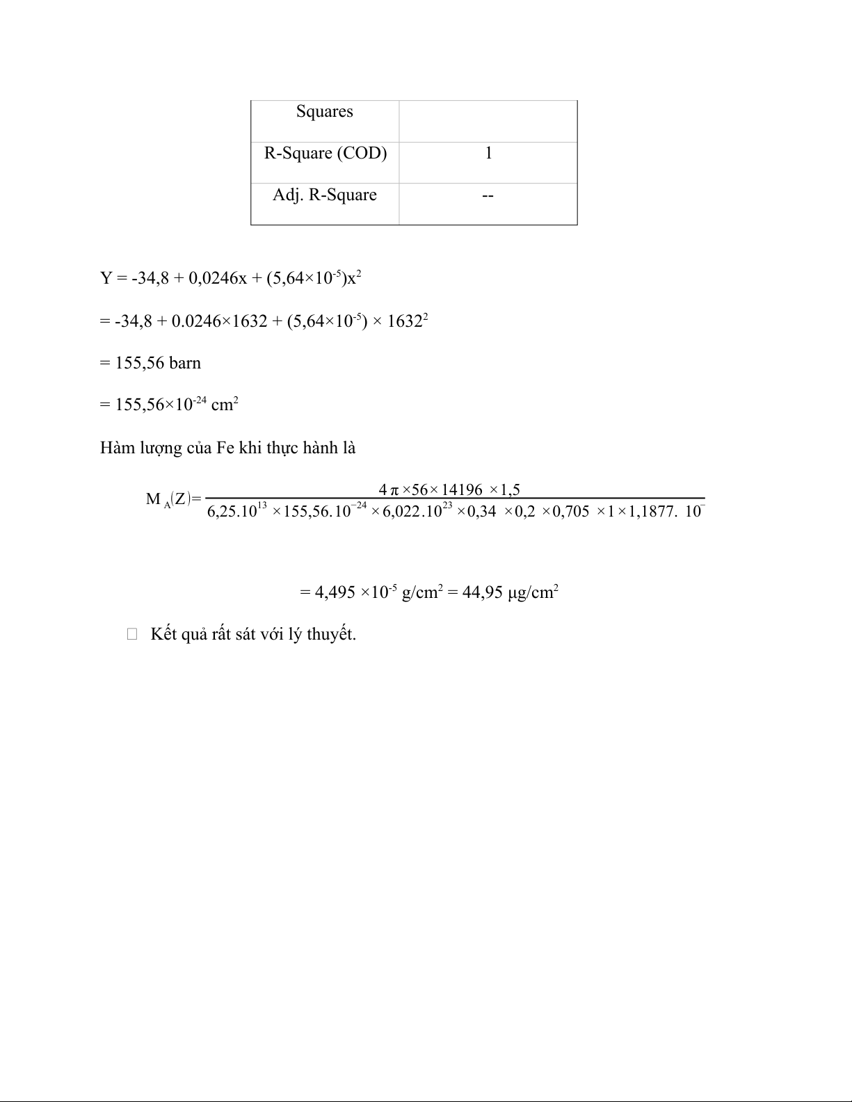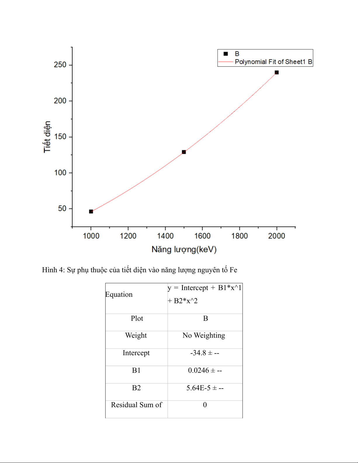 Hình 4: Sự phụ thuộc của tiết diện vào năng lượng nguyên tố Fe y = Intercept + B1*x^1 Equation + B2*x^2 Plot B Weight No Weighting Intercept -34.8 ± -- B1 0.0246 ± -- B2 5.64E-5 ± -- Residual Sum of 0 Squares R-Square (COD) 1 Adj. R-Square --