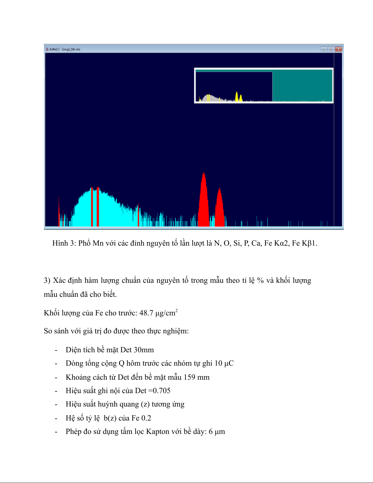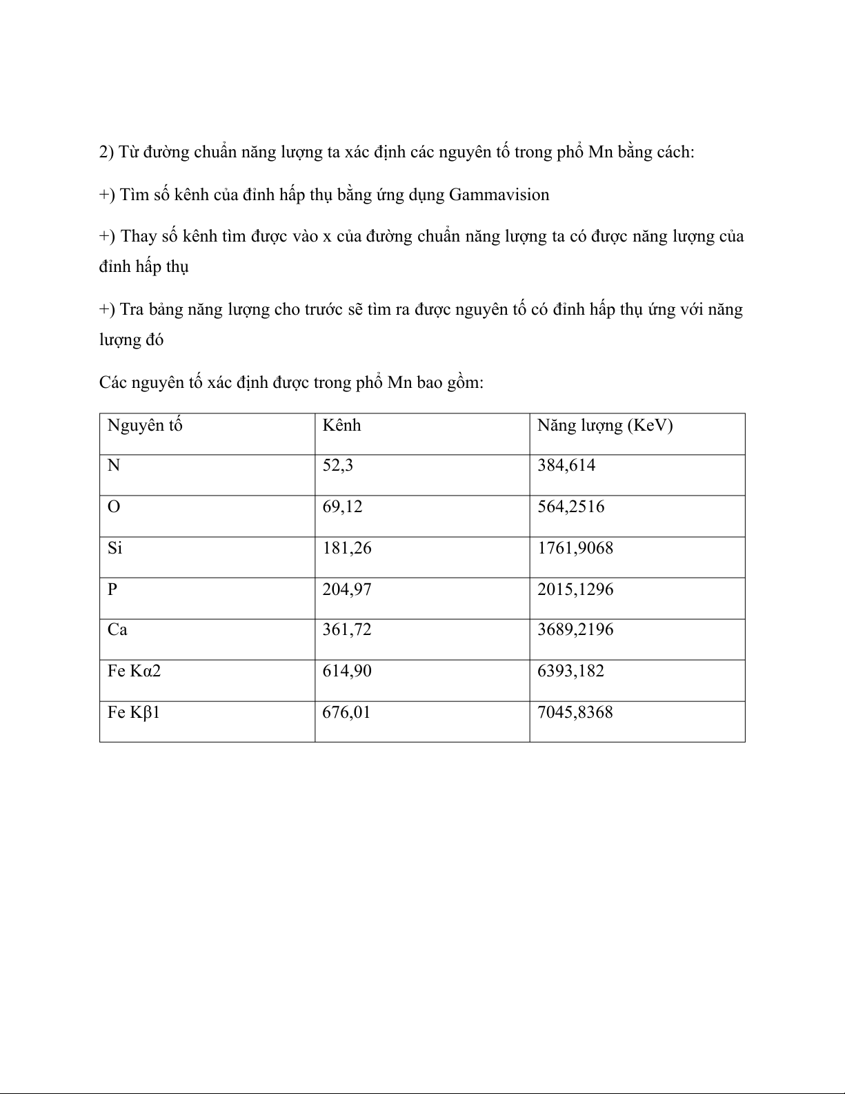 Các nguyên tố xác định được trong phổ Mn bao gồm: Nguyên tố Kênh Năng lượng (KeV) N 52,3 384,614 O 69,12 564,2516 Si 181,26 1761,9068 P 204,97 2015,1296 Ca 361,72 3689,2196 Fe Kα2 614,90 6393,182 Fe Kβ1 676,01 7045,8368