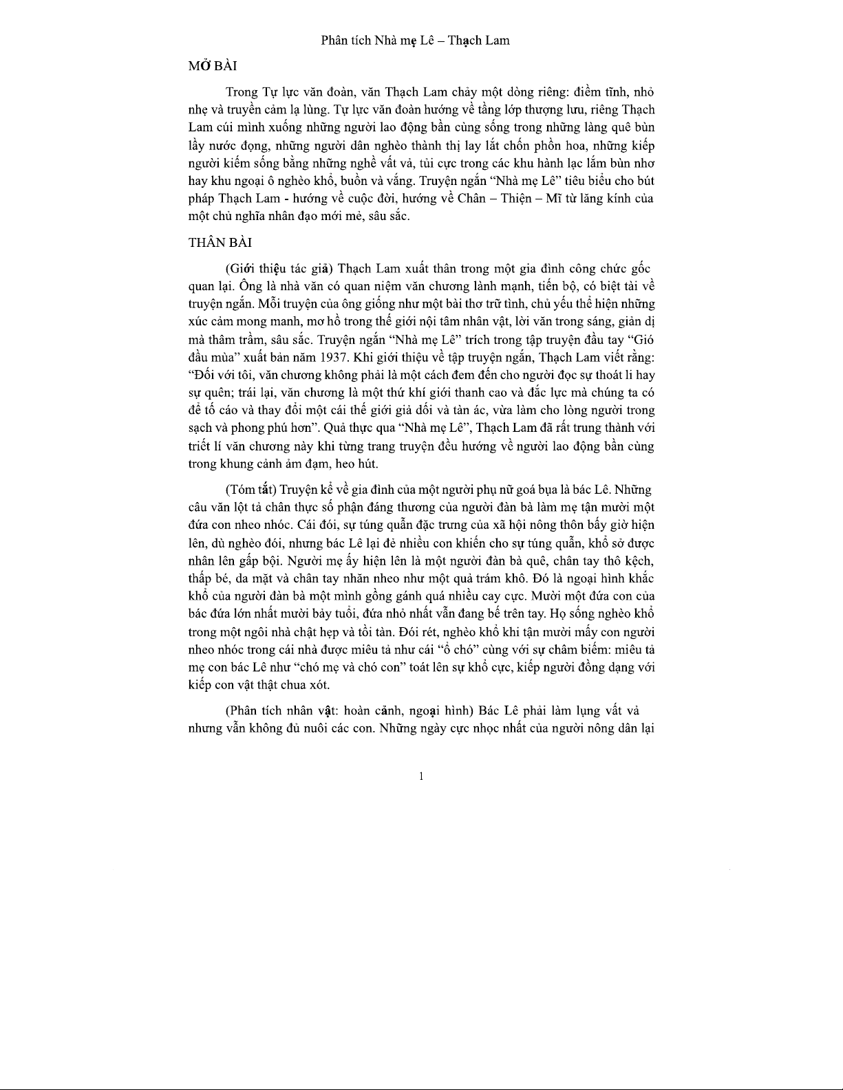 Phân Tích Nhà Mẹ Lê - Tác Phẩm Của Thạch Lam (GKII)