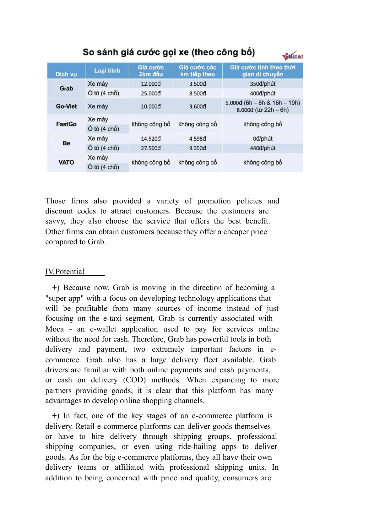 Other firms can obtain customers because they offer a cheaper price compared to Grab. IV, Potential :