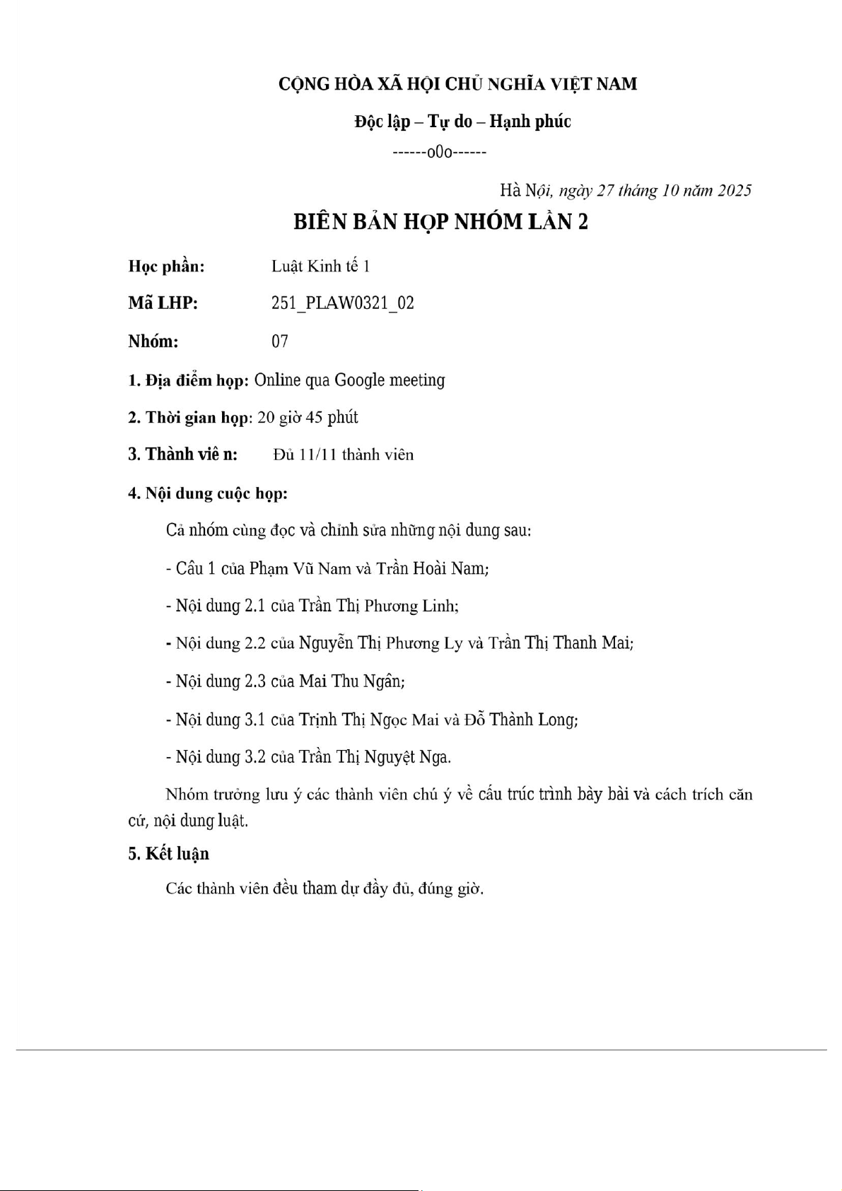 3.1. Nhận xét về các thỏa thuận giữa các thành viên trong công ty cổ phần X ................... 27 lệ kiểm soát ký kết hợp đồng đồng 1 NỘI DUNG CÂU 1