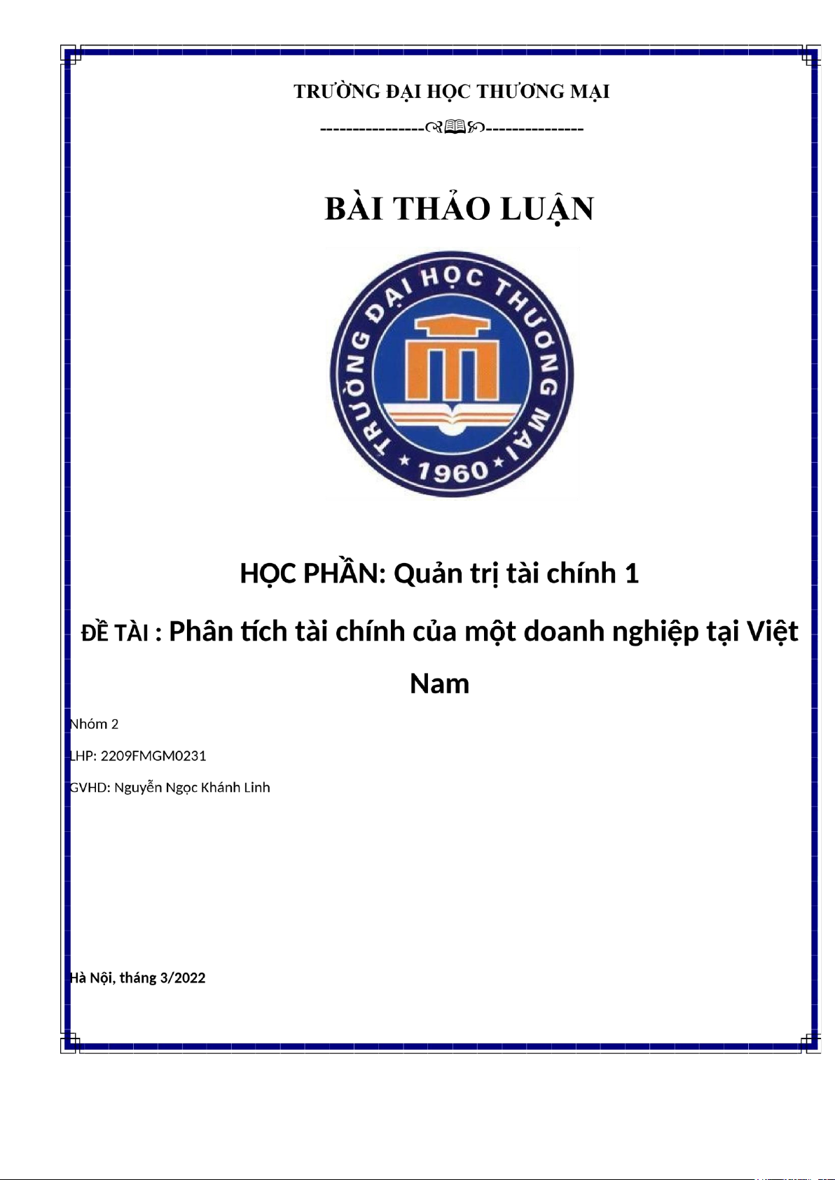 nhóm 2 đã lựa chọn đề tài: “Phân tích tài chính của một doanh nghiệp tại Việt Nam” trong đó cụ thể