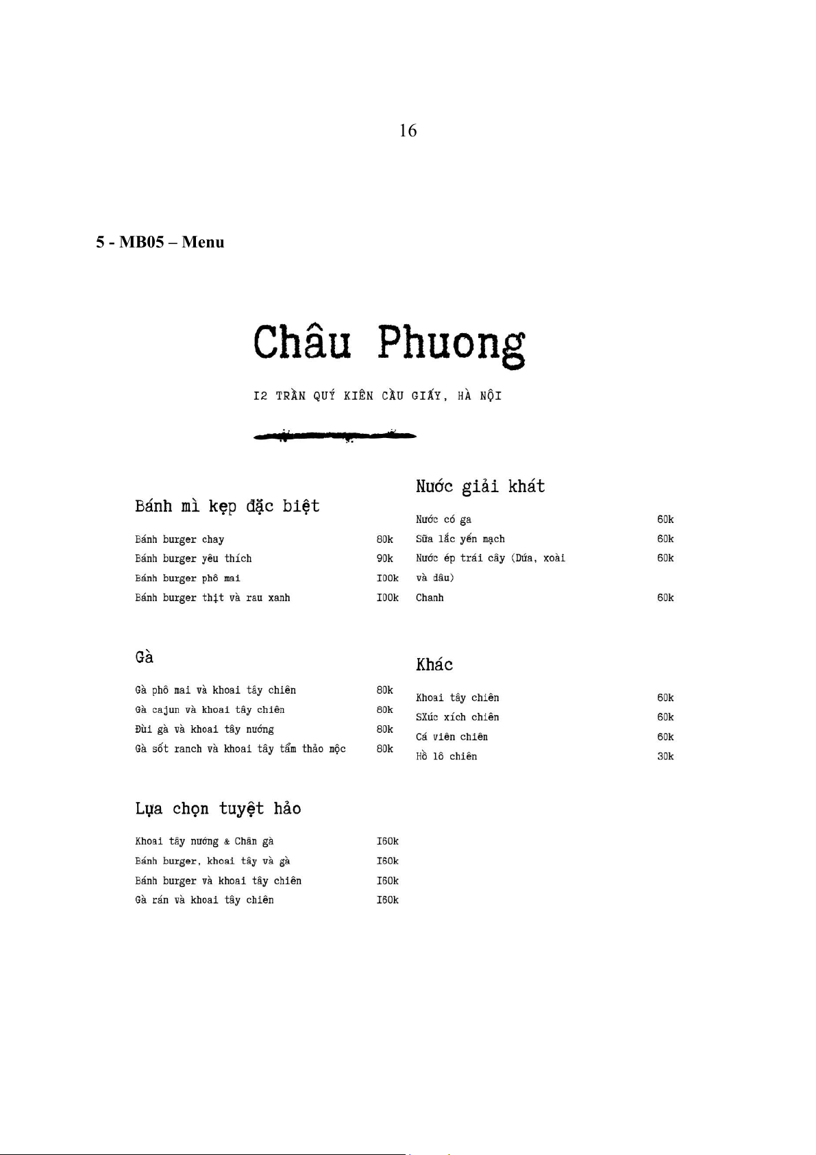 - MB03 : Phiếu đề xuất cập nhật giá cả thực đơn - MB05 : Menu