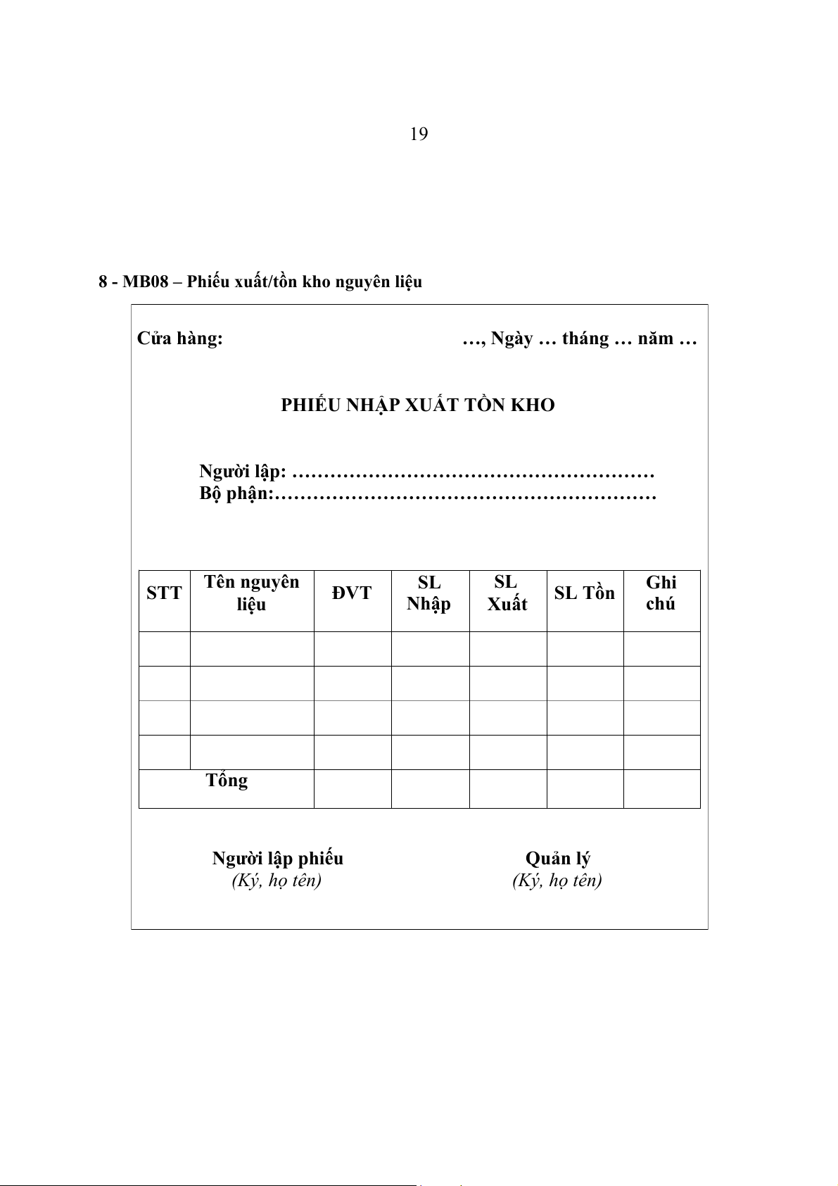8 - MB08 – Phiếu xuất/tồn kho nguyên liệu Cửa hàng: