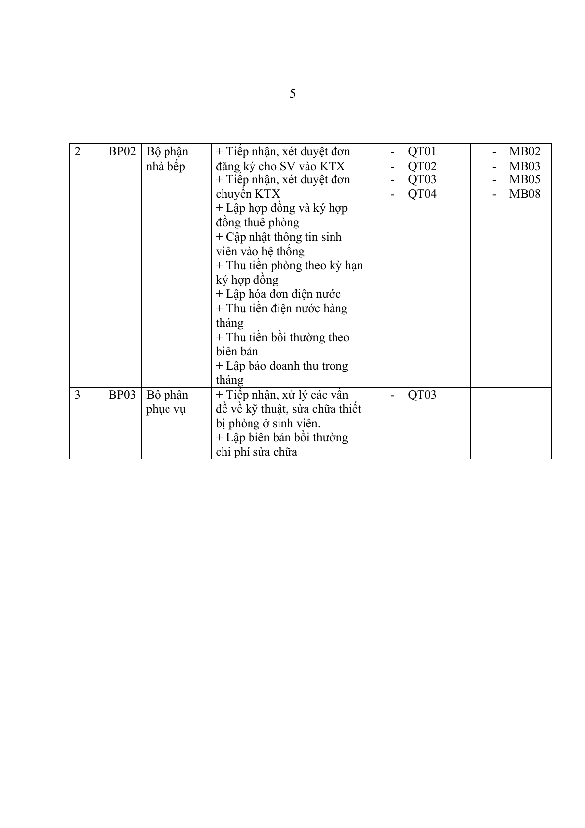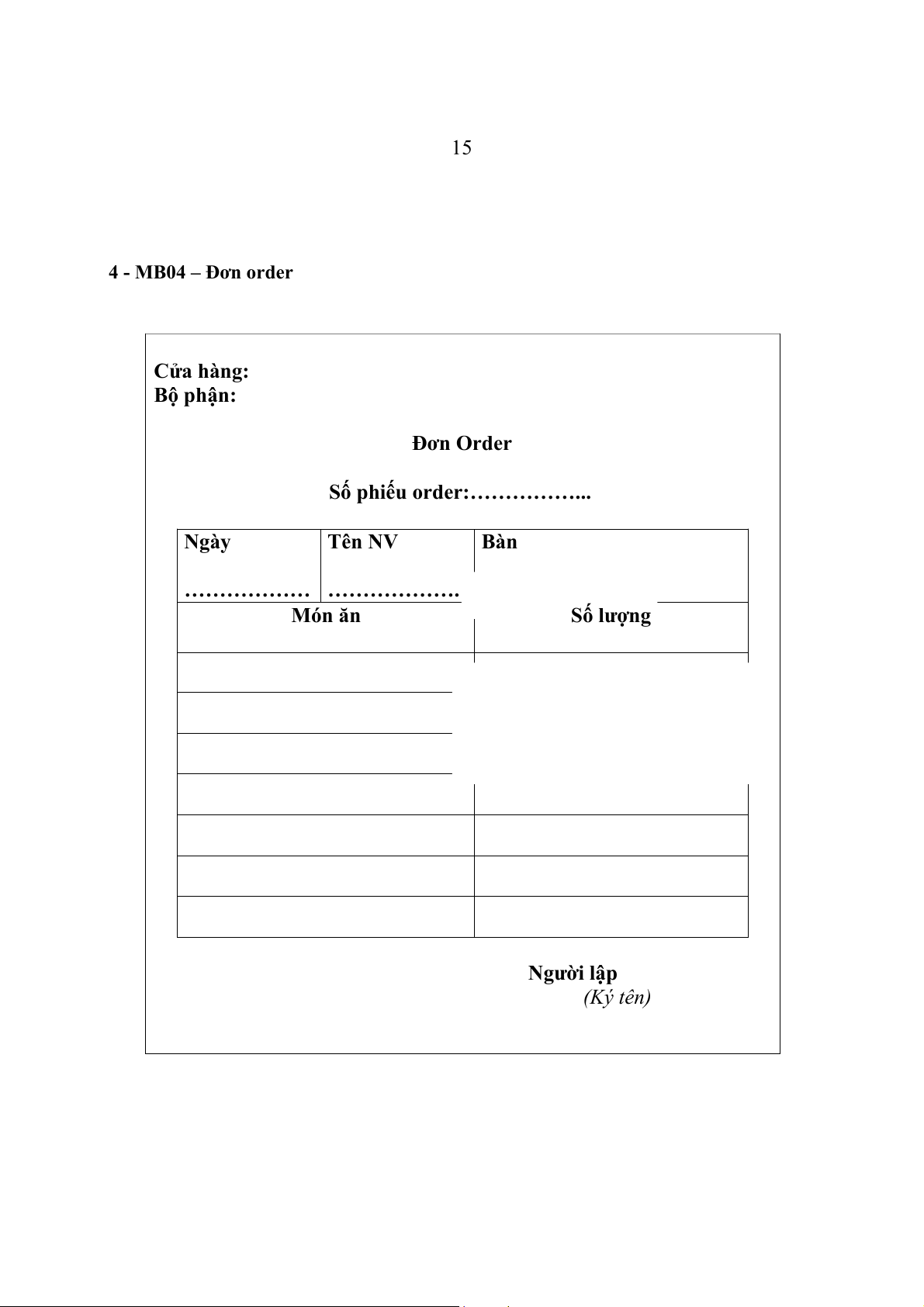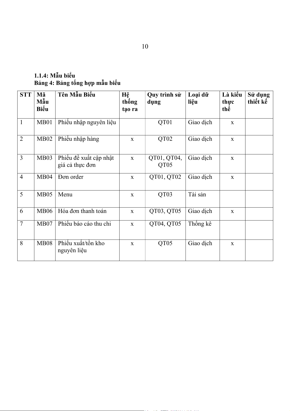 MB03 Phiếu đề xuất cập nhật x QT01, QT04, Giao dịch x giá cả thực đơn QT05 4 MB04 Đơn order x QT01, QT02 Giao dịch x 5 MB05 Menu x QT03 Tài sản 6 MB06 Hóa đơn thanh toán x QT03, QT05 Giao dịch x 7 MB07 Phiếu báo cáo thu chi x QT04, QT05 Thống kê 8 MB08 Phiếu xuất/tồn kho x QT05 Giao dịch x nguyên liệu 11