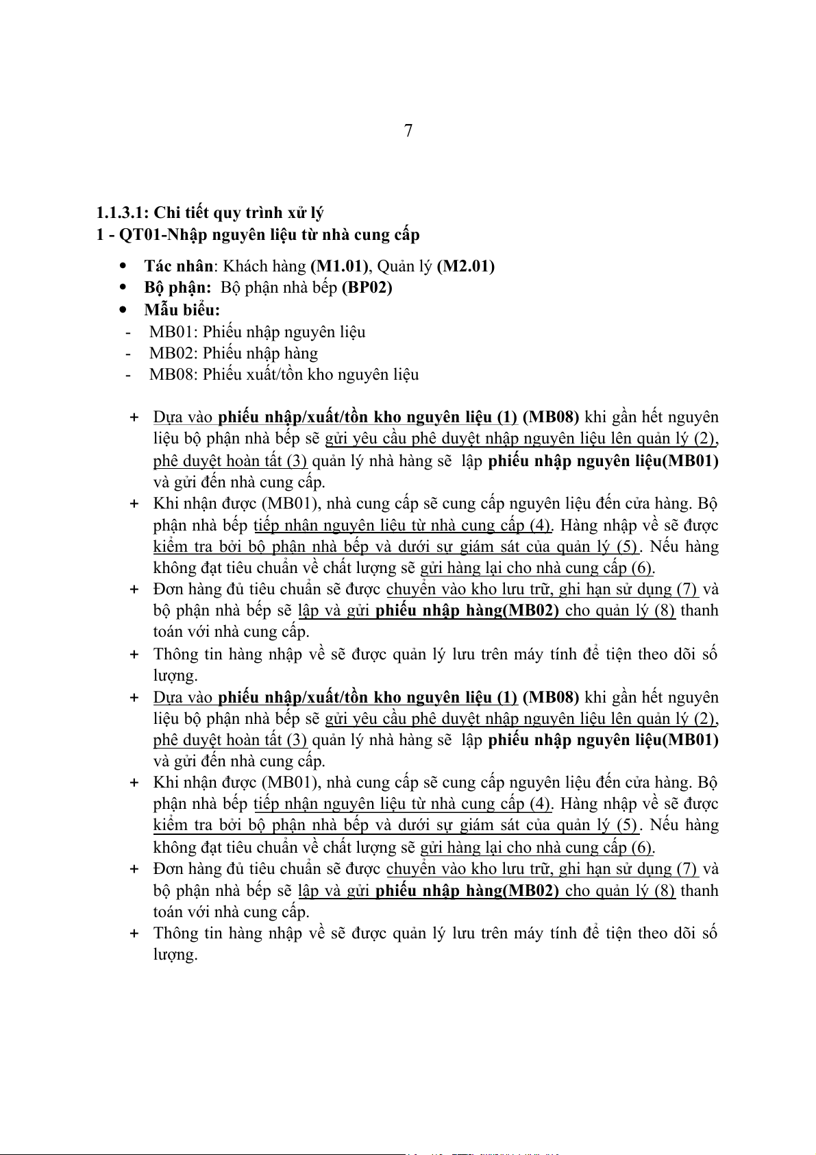 Môi trường tham Bộ phận tham T quy gia gia trình 1 QT01 Nhập nguyên liệu - MB01: Phiếu Nhà cung cấp 1: BP02 từ nhà cung cấp nhập nguyên liệu (M1.01) - MB02: Phiếu Quản lý (M2.01) nhập hàng - MB08: Phiếu xuất/tồn kho nguyên liệu 2 QT02 Thay đổi giá cả - MB03 : Phiếu đề Quản lý (M2.01) 2: BP01, BP02 trên Menu xuất cập nhật giá cả thực đơn - MB05 : Menu 3 QT03 Order và thanh - MB04: Đơn order Khách hàng 3: BP01, BP02, toán đơn hàng - MB05 : Menu (M1.02) BP03 - MB06: Hóa đơn Quản lý (M2.01) thanh toán 4 QT04 Kiểm kho nguyên - MB08: Phiếu Quản lý (M2.01) 1: BP02 liệu xuất/tồn kho nguyên liệu 5 QT05 Báo cáo thu chi - MB02: Phiếu Quản lý (M2.01) 1: BP01 trong ngày nhập hàng - MB07 : Phiếu báo cáo thu chi 7