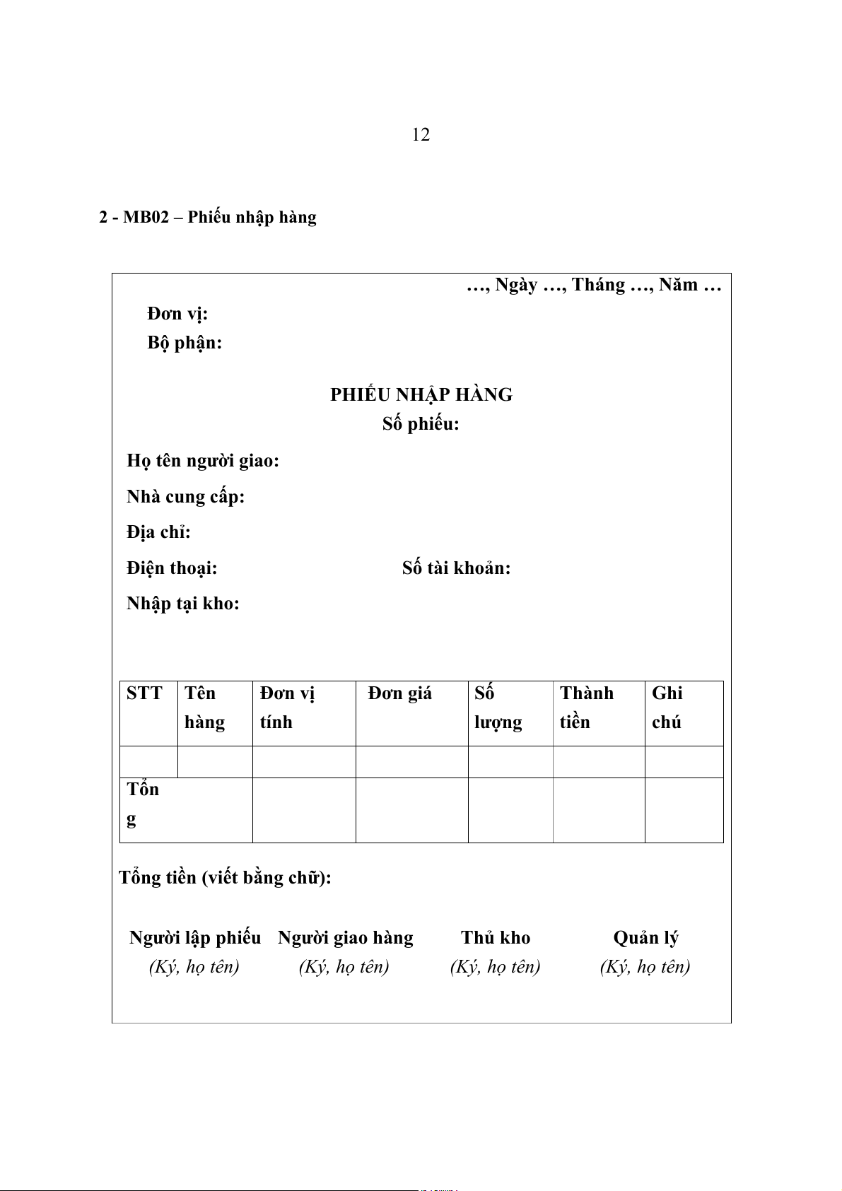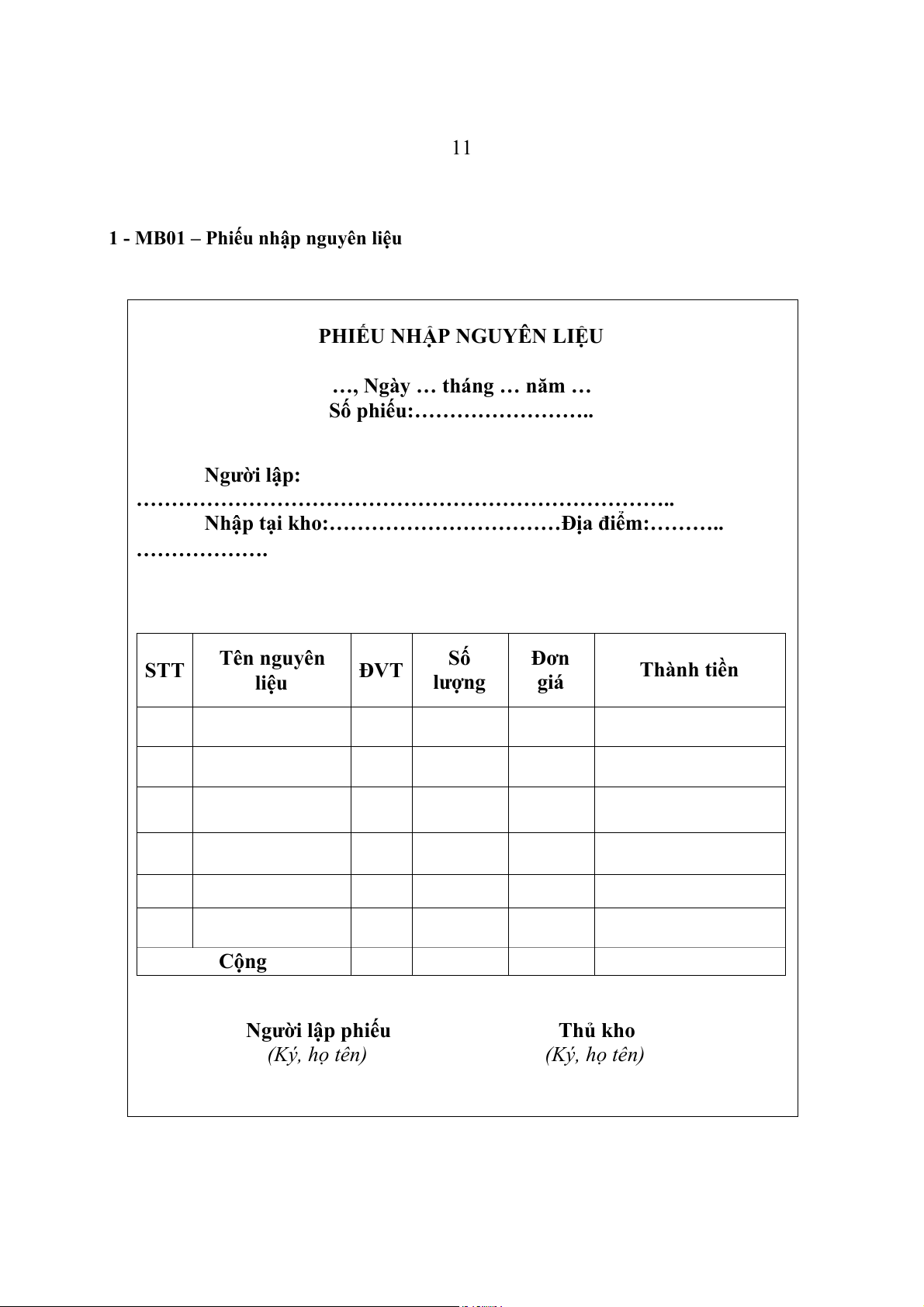 - MB01: Phiếu nhập nguyên liệu - MB02: Phiếu nhập hàng
