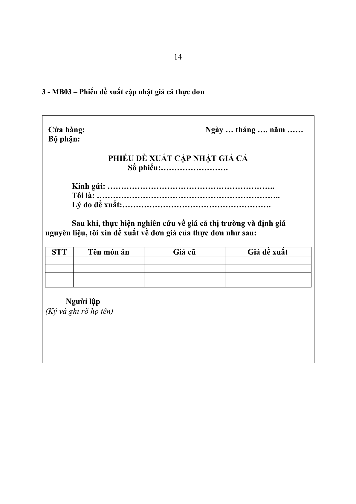 3 - MB03 – Phiếu đề xuất cập nhật giá cả thực đơn