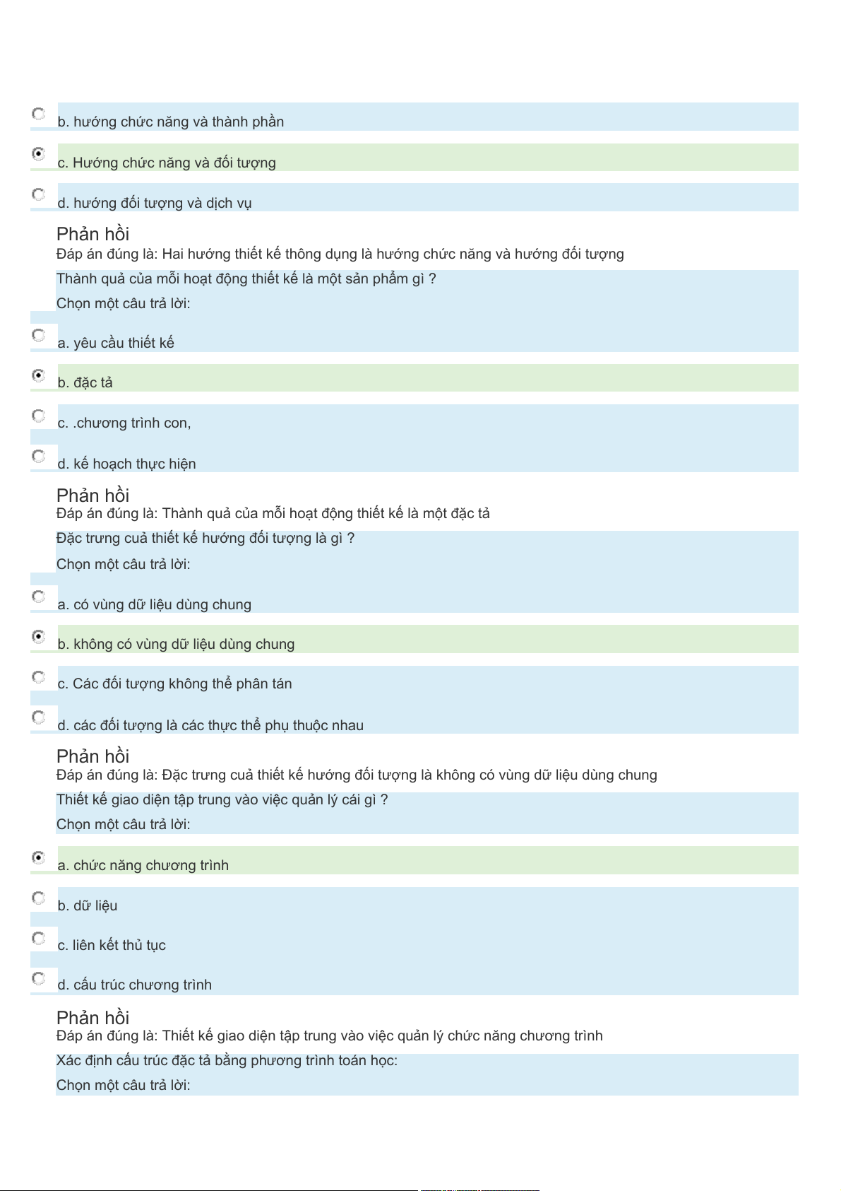 Thành quả của mỗi hoạt động thiết kế là một sản phẩm gì ? Chọn một câu trả lời: a. yêu cầu thiết kế b. đặc tả c. .chương trình con, d. kế hoạch thực hiện Phản hồi