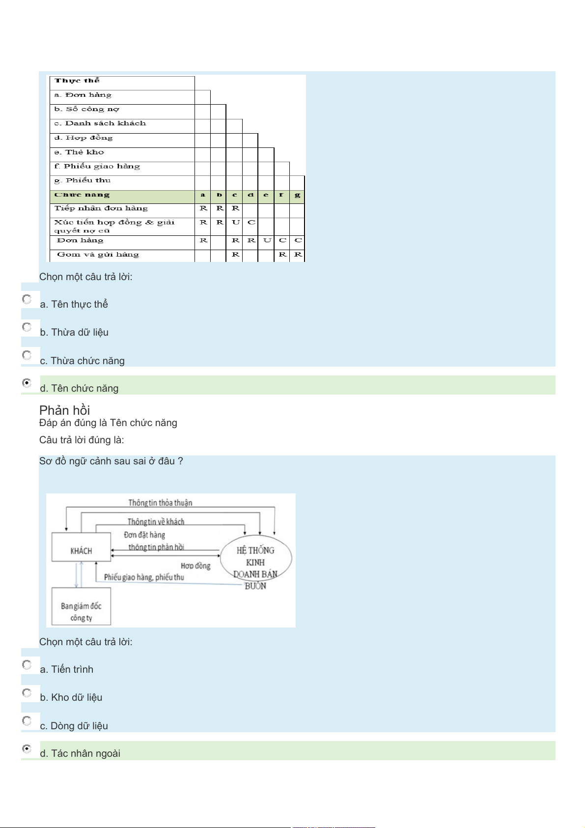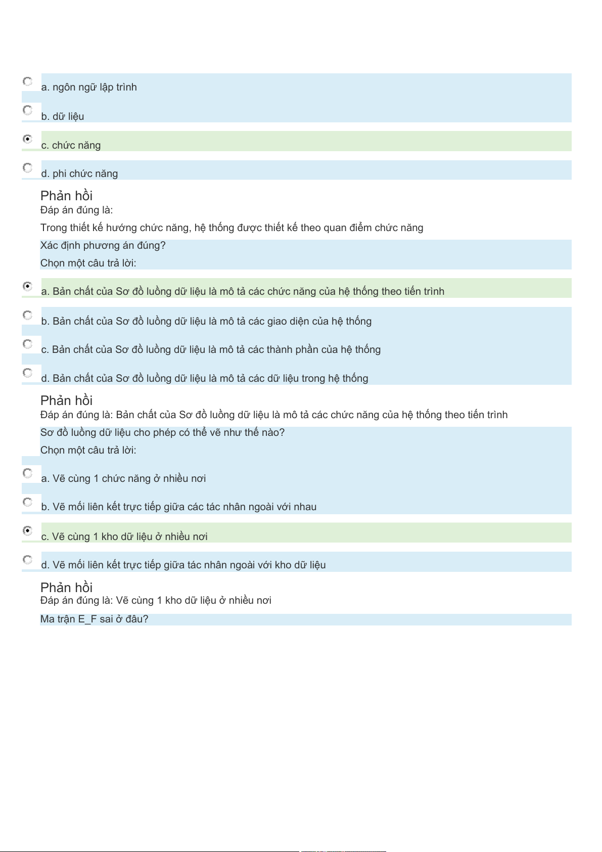 Đáp án đúng là: Vẽ cùng 1 kho dữ liệu ở nhiều nơi Ma trận E_F sai ở đâu? Chọn một câu trả lời: a. Tên thực thể b. Thừa dữ liệu c. Thừa chức năng d. Tên chức năng Phản hồi